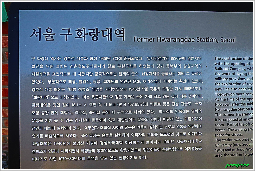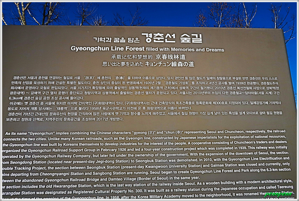 서울 노원구 공릉동 소재 화랑대 철도공원은 경춘선 숲길 북동쪽 끝 부문에 위치하며, 서울의 마지막 간이역이던 옛 화랑대역을 공원화했습니다. 1939년 경춘선 개통 후 2010년 운행이 중단된 경춘선 철로구간을 공원으로 꾸민 곳으로, 기존 폐선을 걷어내지 않고 그대로 존치해 옛 경춘선의 추억도 살리고 산책로도 제공하는 낭만적인 공간으로 탈바꿈되었습니다.