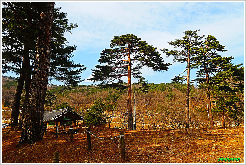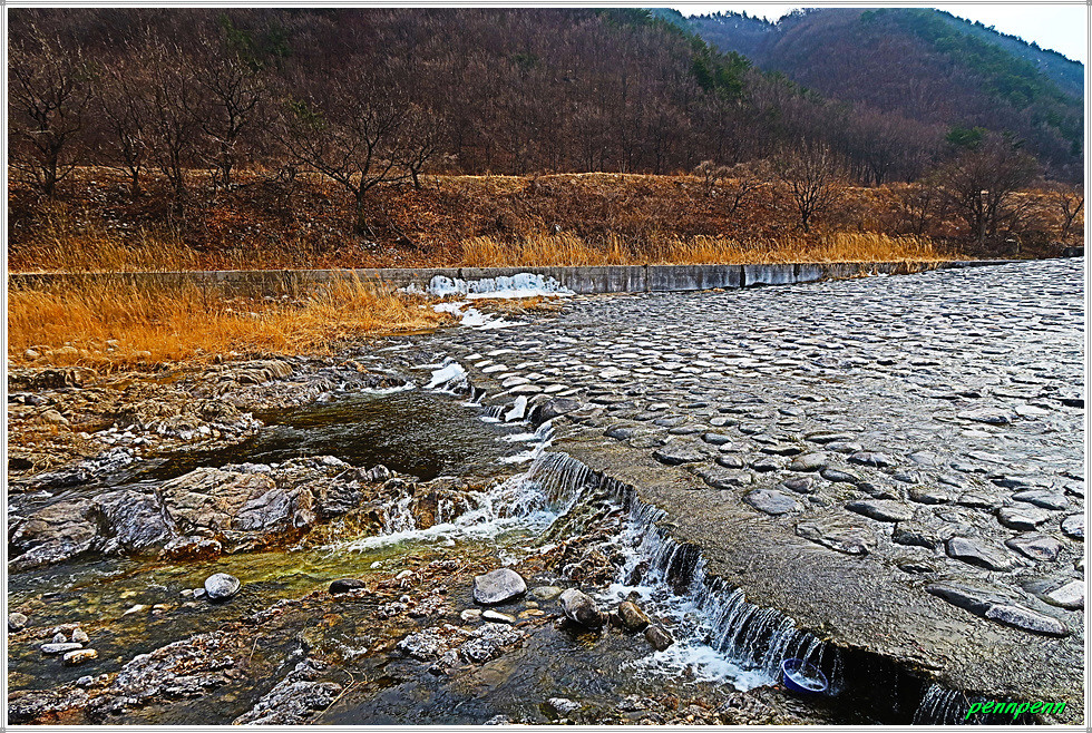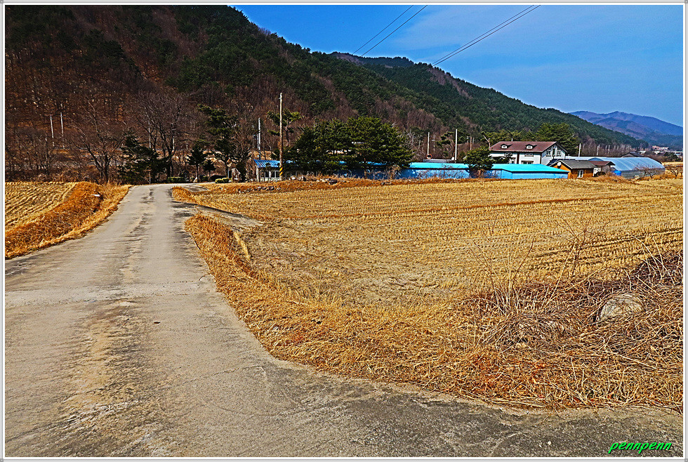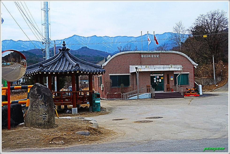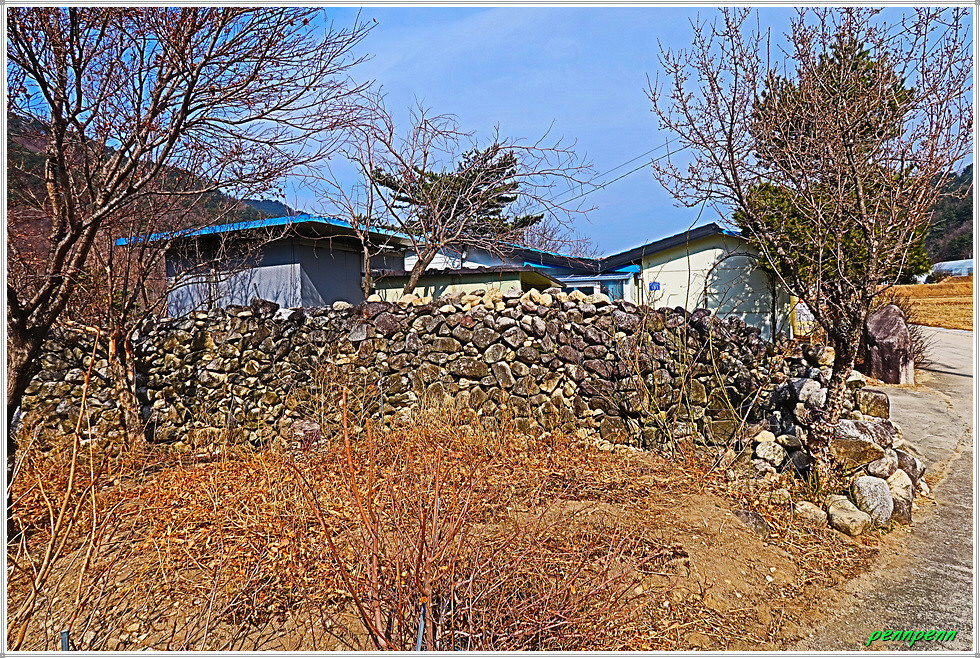 소똥령마을 휴선정에서 북천을 따라 북상합니다. 마을의 풍경은 매우 한적하군요. 울타리 안에는 대형 고니가 지나는 행인을 보며 소리를 지릅니다. 일반적으로 고니는 깃털이 새하얗다는데, 이놈들은 누런빛을 띠는 게 색다릅니다. 길섶에는 당산나무처럼 보이는 쌍둥이 나무도 보이고 백색의 자작나무도 이방인을 맞아줍니다. 날씨는 맑고 기온은 영상이지만 간혹 불어오는 강풍에 몸을 움츠립니다.