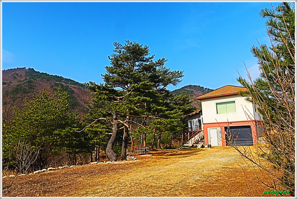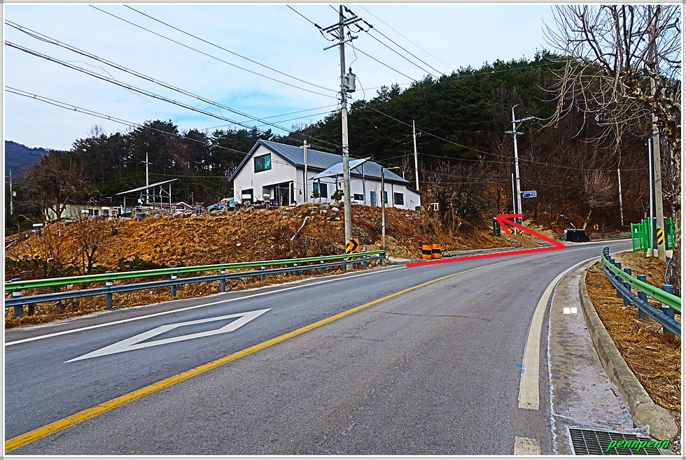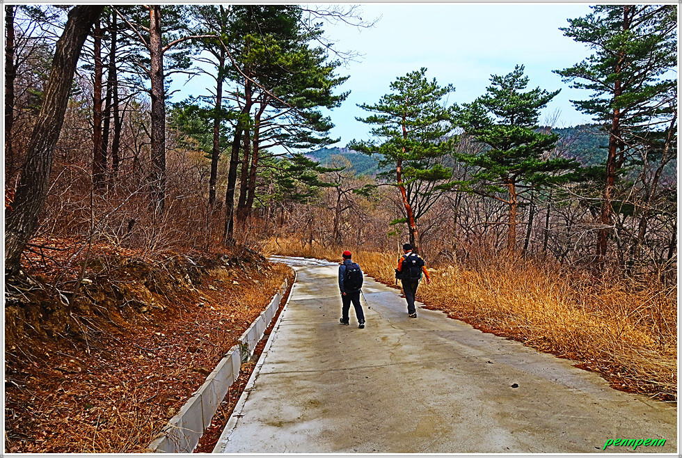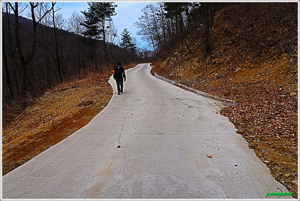 아제부터는 북천과 작별하고 잠시 46번 국도를 만나 부동교를 건넌 후 광산2리 경노당을 뒤로하고 좌측의 가마골로 접어듭니다. 그런데 가마골 도로는 점점 오르막으로 변합니다. 오늘 오전에 이미 평화의 길 31-1코스를 걸으며 급경사구간인 소통령 3개봉을 넘은 후라서 오르막을 보자 덜컥 겁이 납니다. 골짜기가 점점 깊어짐에 따라 오르막은 더 심해집니다. 고개 정상(가마골재)을 넘어가 안도한 순간 길은 탑평교를 건너 다시 46번 국도를 만나 오르막으로 변합니다.