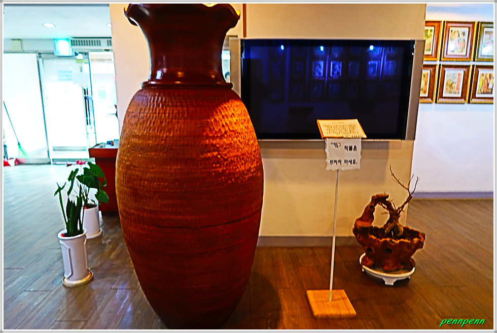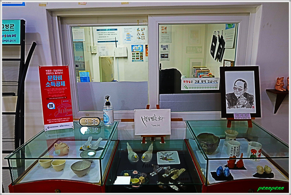 안으로 들어서니 입구에 머그잔과 다기 등 각종 기념품 같은 제품들이 전시되어 있고 한쪽에 전석진 사진이 놓여 있습니다. 안쪽에도 전석진의 흉상이 놓여 있고 이름 아래 “문화기획가, 진부령미술관장”이라 적혀 있습니다. 누구인지 궁금해 검색을 해봐도 자세한 정보가 없군요.