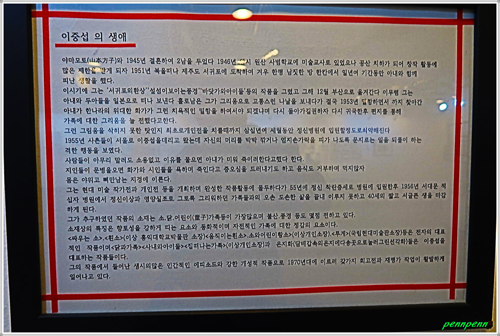 이중섭의 작품은 하나 사진을 찍어서 감상해도 지루하지 않을 것입니다. 그런데 필자는 DMZ 평화의 길 31-1코스를 답사하려고 왔다가 출발점에서 진부령 미술관을 만났는데 20여명의 참가자 중 미술관을 찾은 이는 필자 포함 겨우 3명뿐이어서 그냥 종종 걸음으로 사진을 막 찍었습니다. 아마도 앞으로 다시는 이곳을 재방문할 기회는 없을 듯해 더욱 아쉬운 순간입니다.
