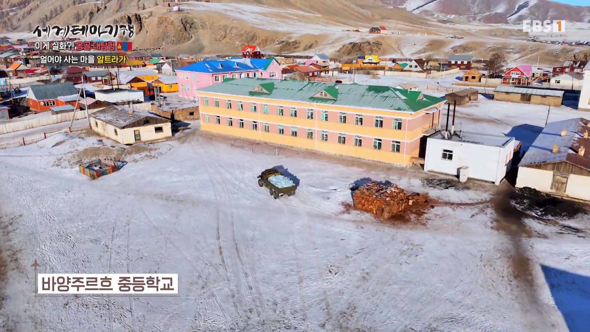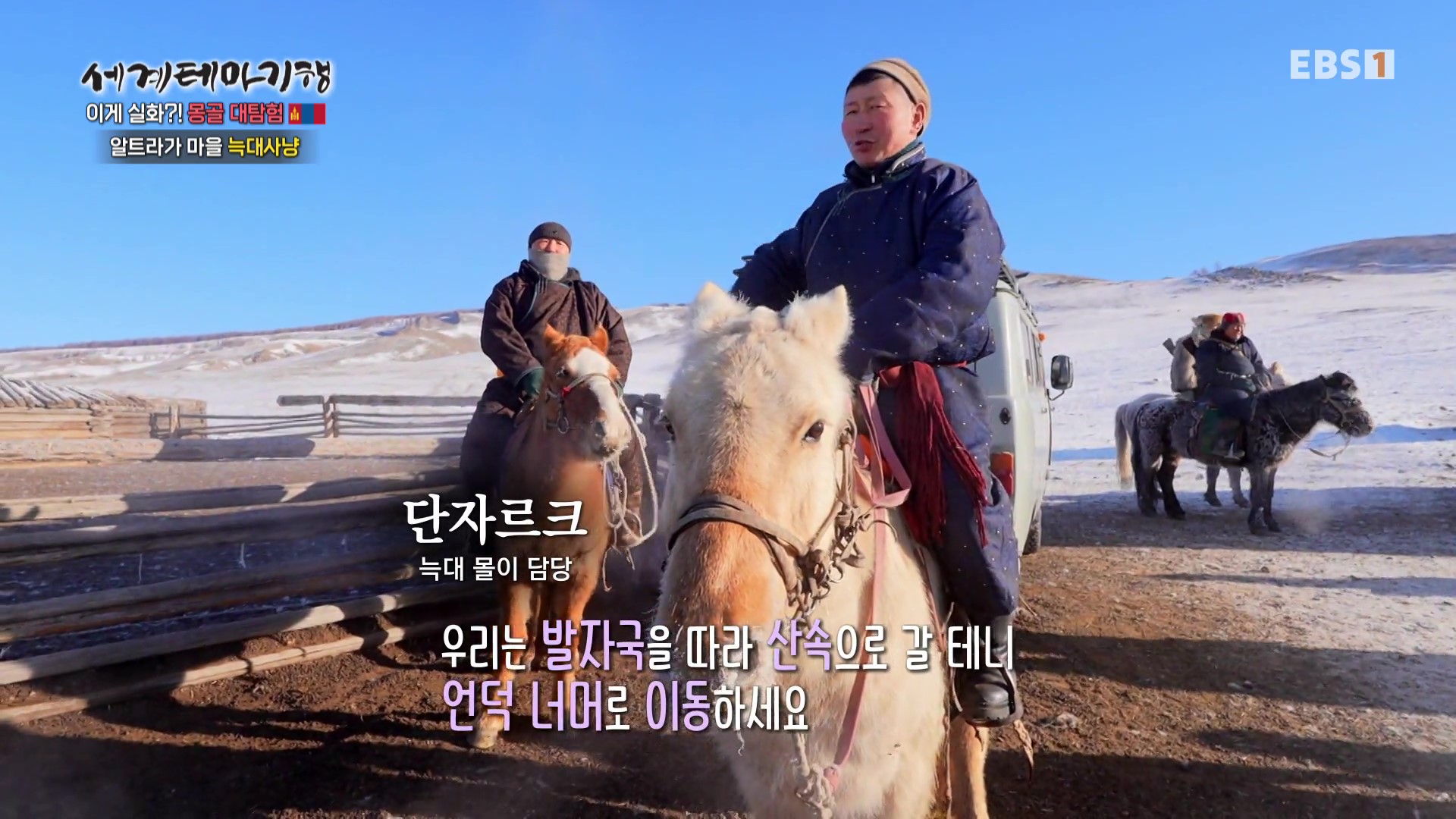 이곳에 있는 바양주르흐 중등학교는 초등학교와 중학교 및 고등학교 과정을 통합 운영합니다. 먼 곳에서도 학생들이 오기에 기숙사를 운영 중입니다. 학생들의 급식을 위해서도 많은 얼음이 필요하지요. 지난밤 먹이를 찾아 마을로 내려온 늑대들이 염소를 공격했다는 소식에 마을 주민들이 늑대소탕작전을 위해 산 아래 축사에 모여 마을뒷산으로 갑니다.