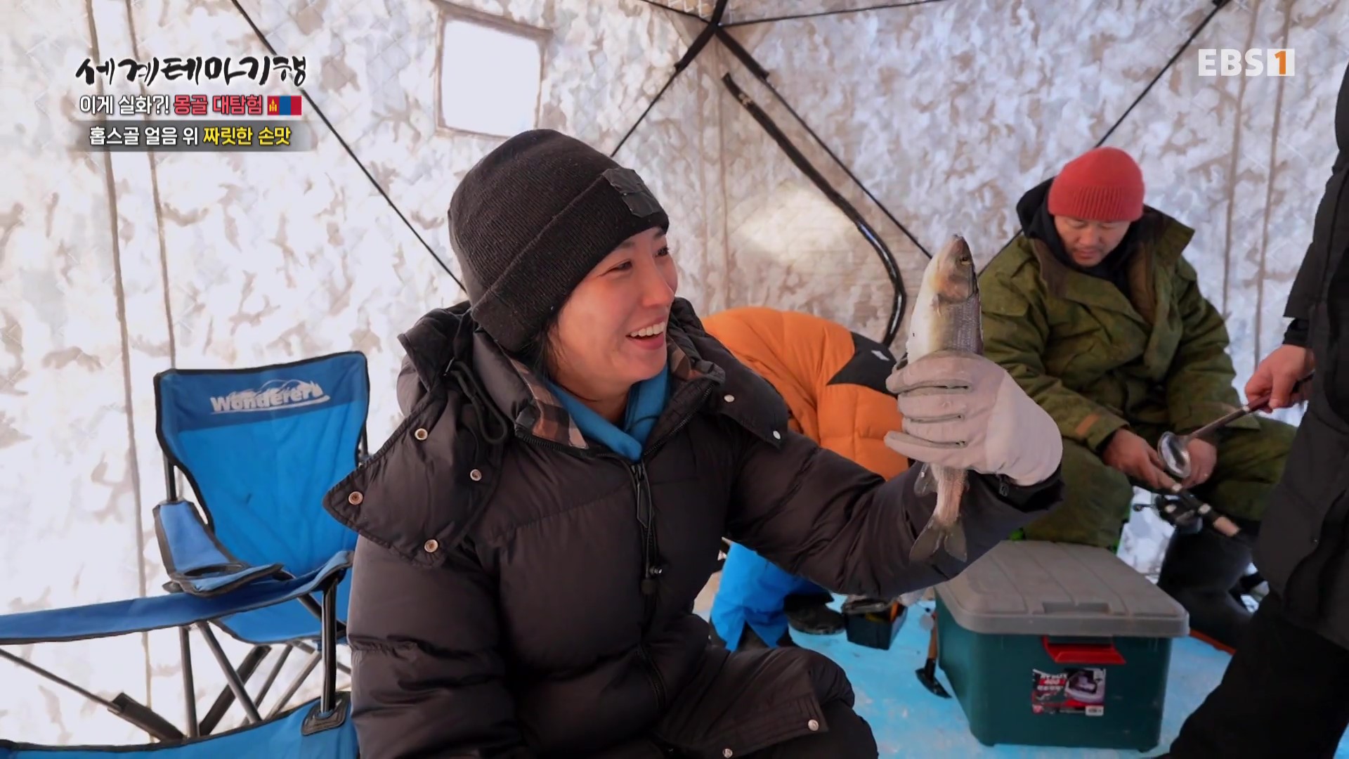 얼음호수 약 120km를 6시간 달려 호수의 북쪽마을인 한흐로 갑니다. 이곳은 유일하게 낚시가 허용되는 지역이라는군요. 러시아국경과 맞닿아 있어 얼음낚시를 하는 러시아인들도 자주 만납니다. 분쇄기로 1m가 넘는 얼음에 구멍을 뚫습니다. 강풍이 불 경우 날씨가 워낙 추워 텐트를 치고 난로를 피운 후 낚시를 합니다. 낚시가족의 12살 된 아들이 낚시전문가입니다. 이 녀석은 생선손질과 요리도 잘합니다. 조금 전 직접 잡은 생선 튀김과 찌개로 배를 채웁니다.