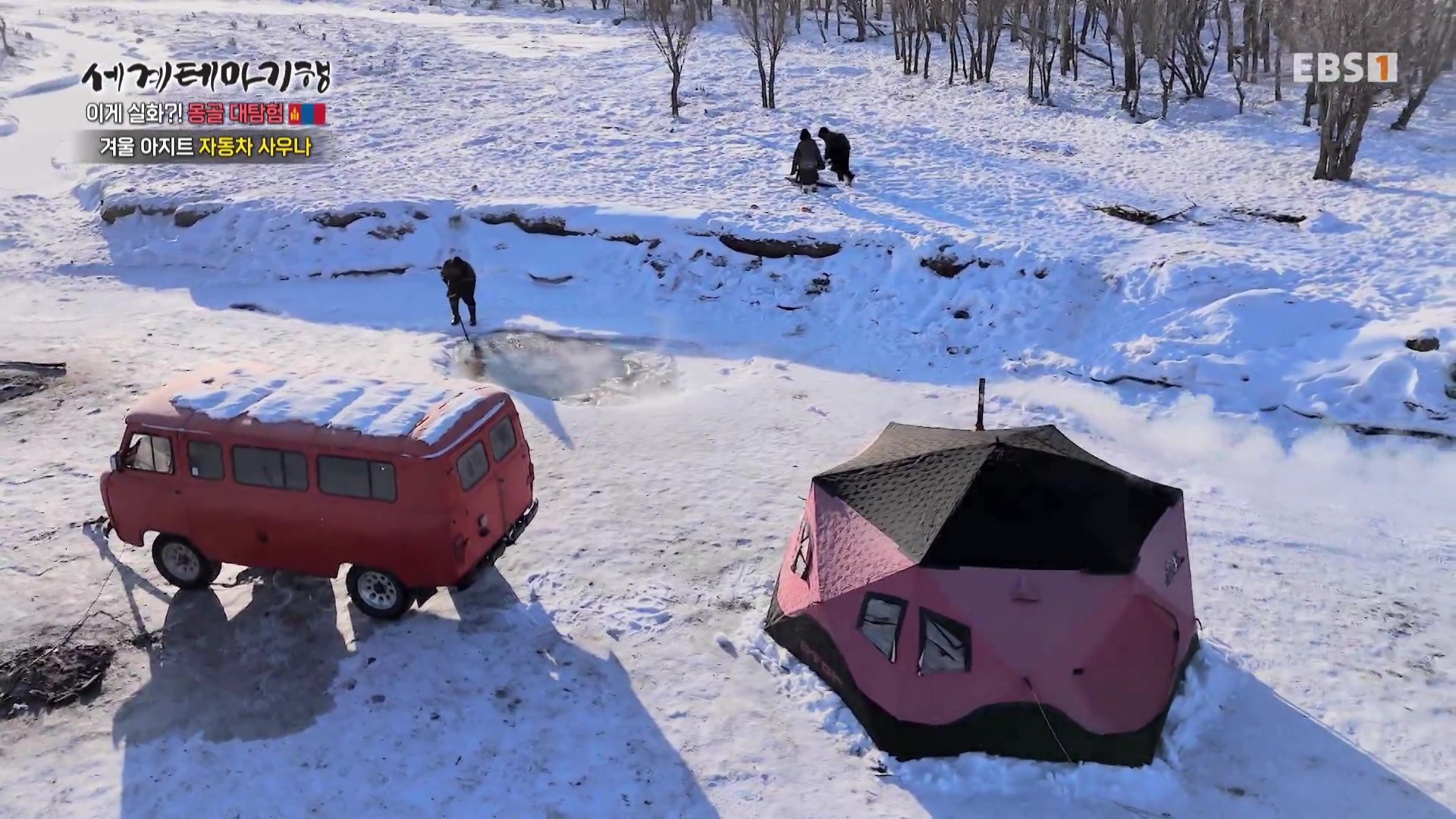 먼저 텐트에서 탈의를 하고 사우나로 개조한 붉은 자동차에 들어가 30분간 몸을 데운 다음 얼음물로 들어갑니다. 겨울에는 야외활동이 부족해서 늘어나는 체중감소를 위해 겨울 사우나를 즐긴답니다. 사우나를 하면서 자작나무 잎으로 마사지를 하면 혈액순환을 돕습니다. 일단 얼음수영을 하고 나오면 춥지 않다는군요.