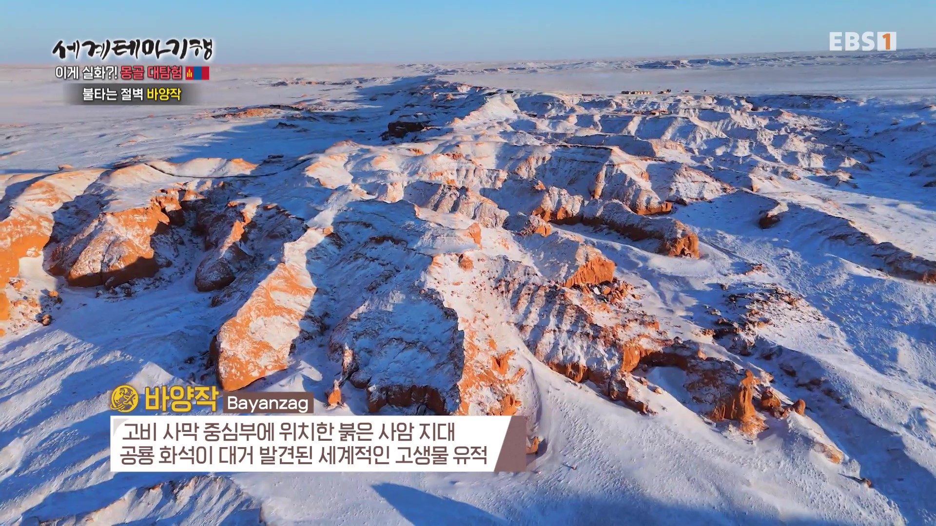 바양작은 고비사막 북쪽의 붉은 사암지대로 공룡화석이 대거 발견된 세계적인 고생물 유적지입니다. 현재는 눈이 내려 하얗게 변한 모습입니다. 고비사막에서 만나는 아름다운 석양은 영원히 잊지 못할 것입니다.