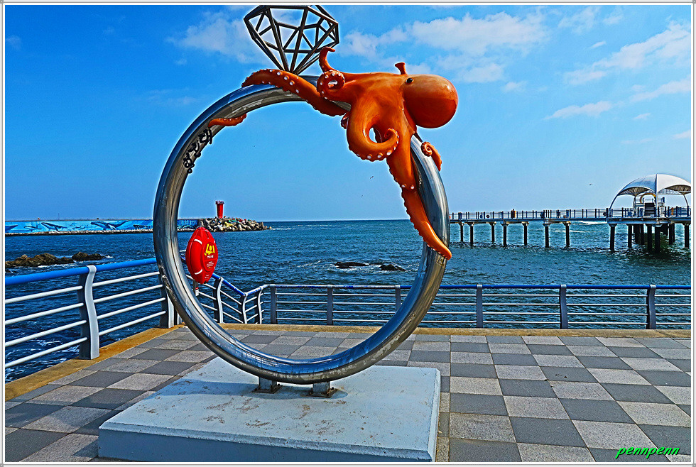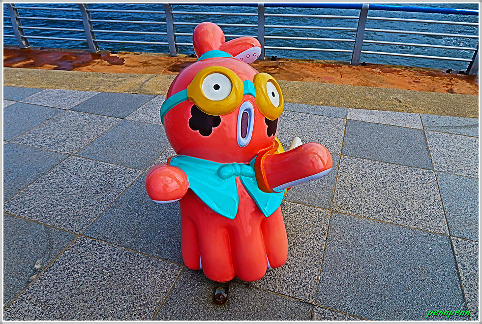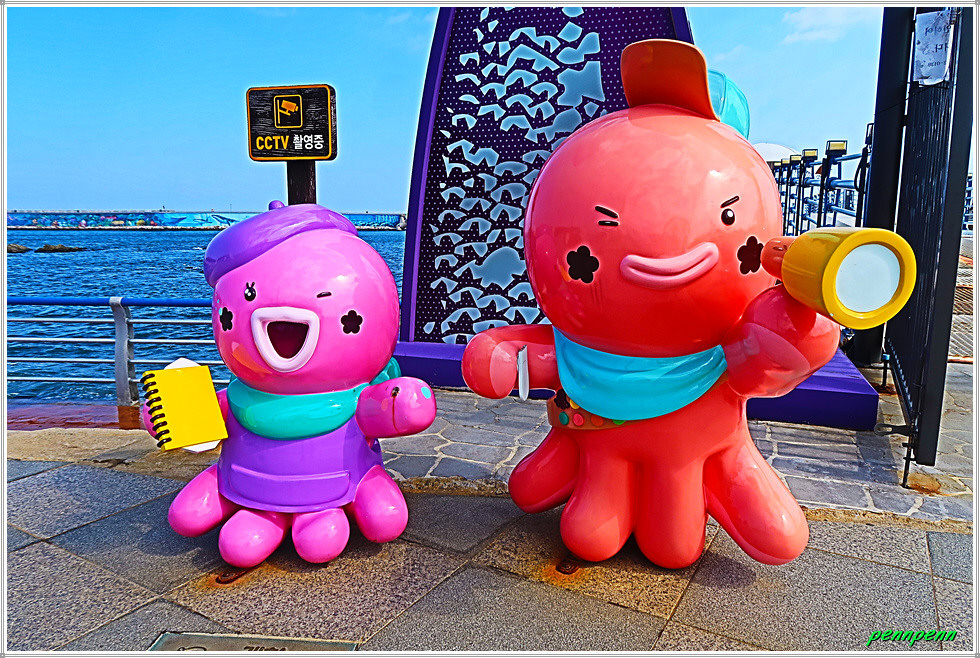 여러 조형물 중 유독 앙증맞게 생긴 작고 귀여운 조형물이 여럿 보이는데요. 이들은 대진항의 대표적인 특산품인 대문어를 형상화한 이곳 현내면 상징 “대무너즈 프렌즈”입니다. 이들은 빅토(정의롭고 적극적인 성격의 리더), 고고(엉뚱 발랄 호기심쟁이 탐험가), 무기(뚝심 있는 소방관), 캐치(낭만을 찾는 예술가), 또기(똑똑하고 소심한 문어박사)로 구성됩니다.