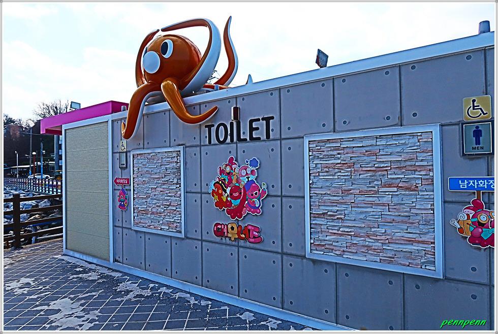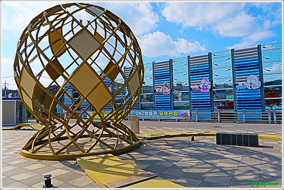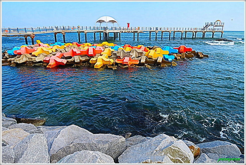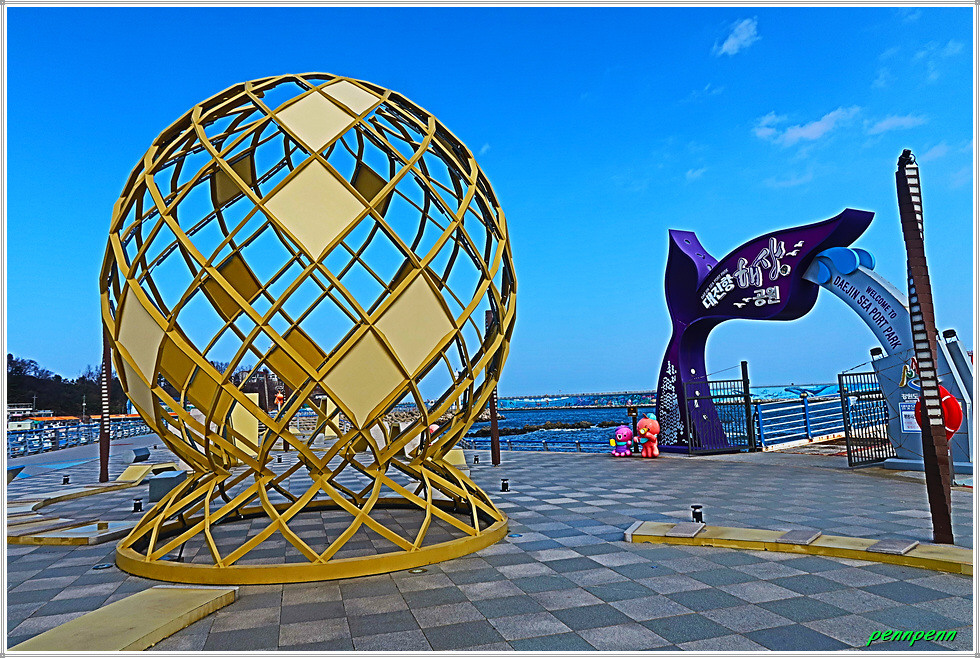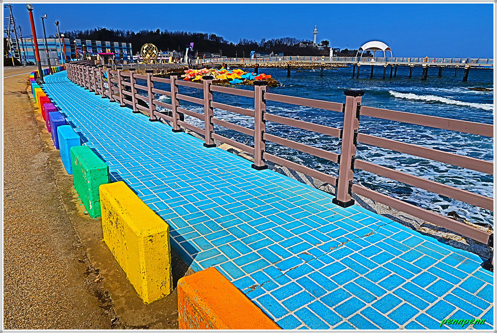 이는 문어머리를 프레임으로 조성한 상징조형물을 기준으로 율동감 있는 문어다리의 모습을 좌우로 표현해 포토존과 쉼터공간으로 활용 가능하도록 디자인한 것입니다. 대진항 특산물인 문어를 컨셉으로 조성된 해상공원을 통하여 고성의 랜드마크 관광지로 홍보해 지역경제가 활성화되도록 한 것이랍니다. 바닷가에는 무지개색으로 칠해진 테트라포트가 바다에 떠 있네요.