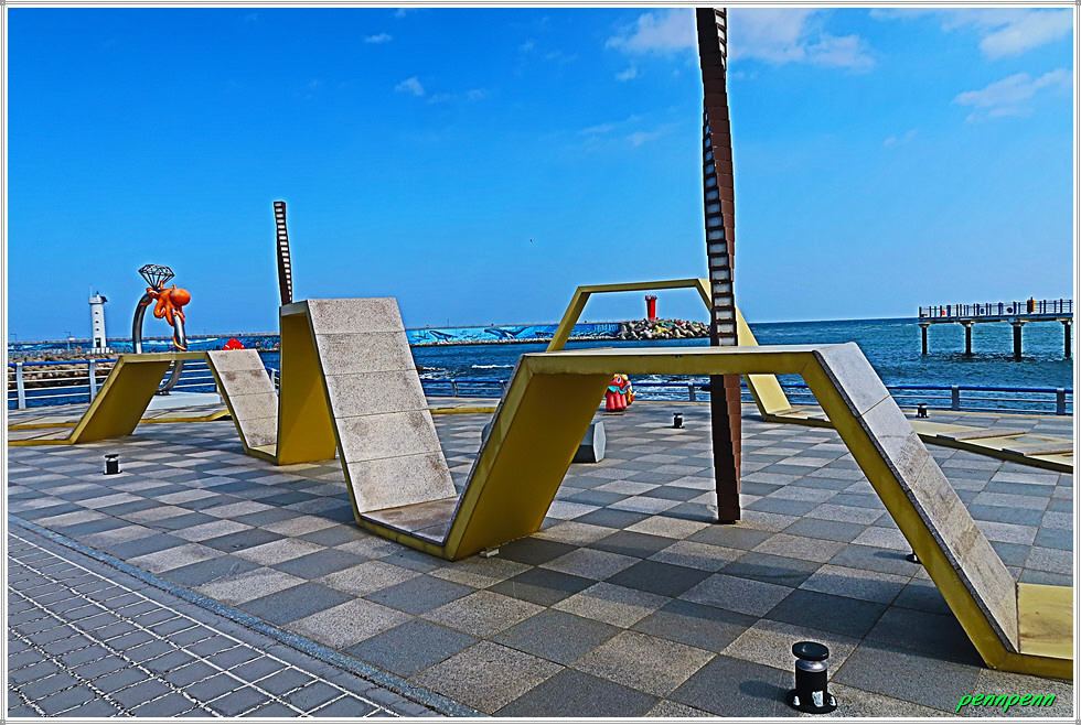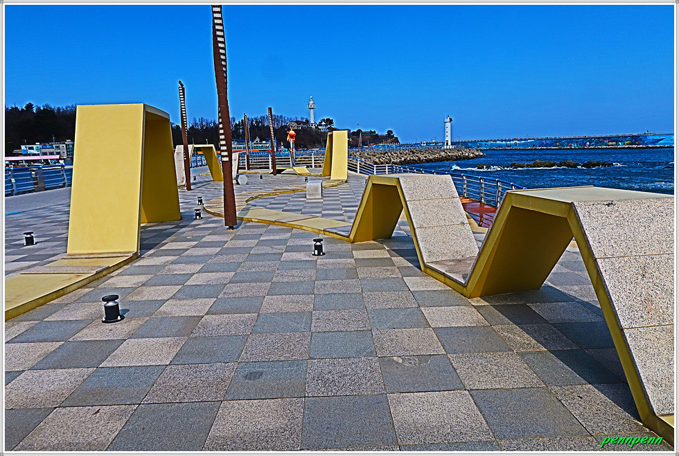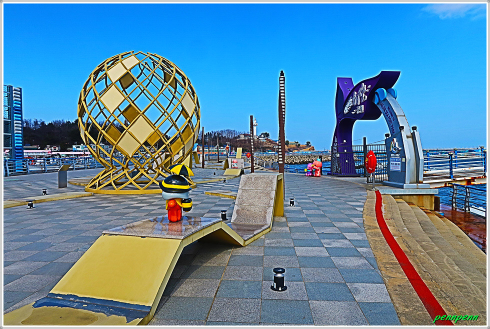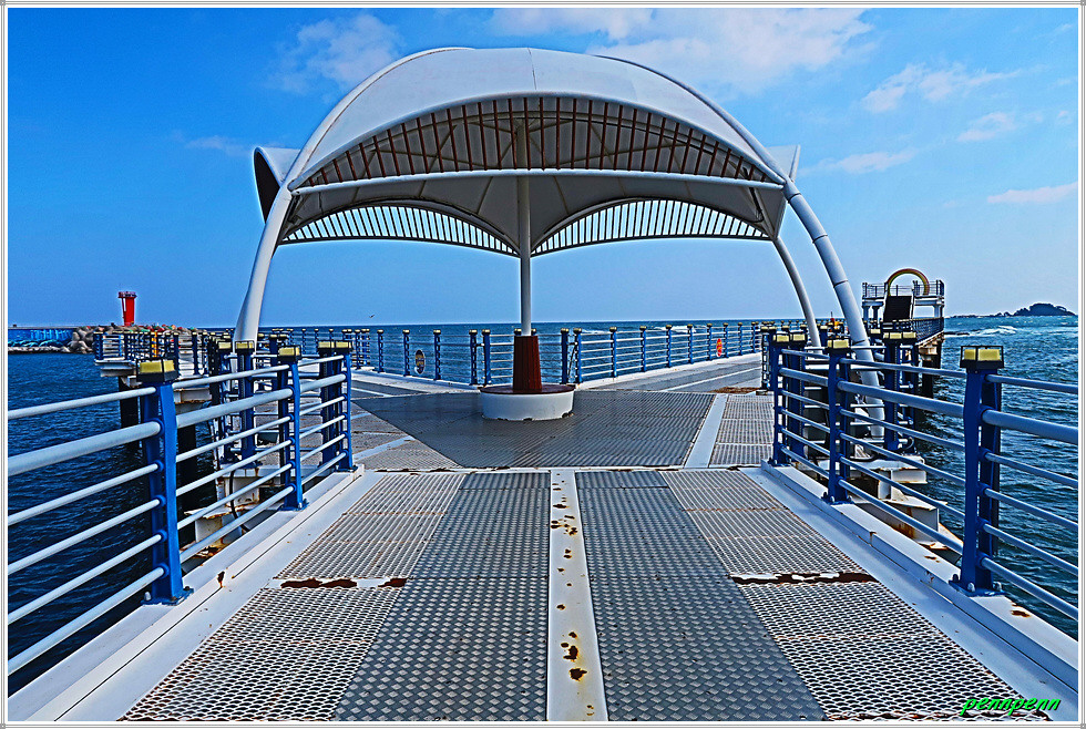 아취형 조형물을 통과하면 중간에 돔 형태의 그늘막 쉼터가 있고 여기서 Y자형 해상데크인데 좌측은 빨간 방파제 등대가 마주 보이고, 우측은 가면 낚시를 즐길 수 있는 잔교를 지나 포토존을 마납니다. 포토존에는 파란 바다를 배경으로 떠오르는 해돋이 조형물이 있습니다.