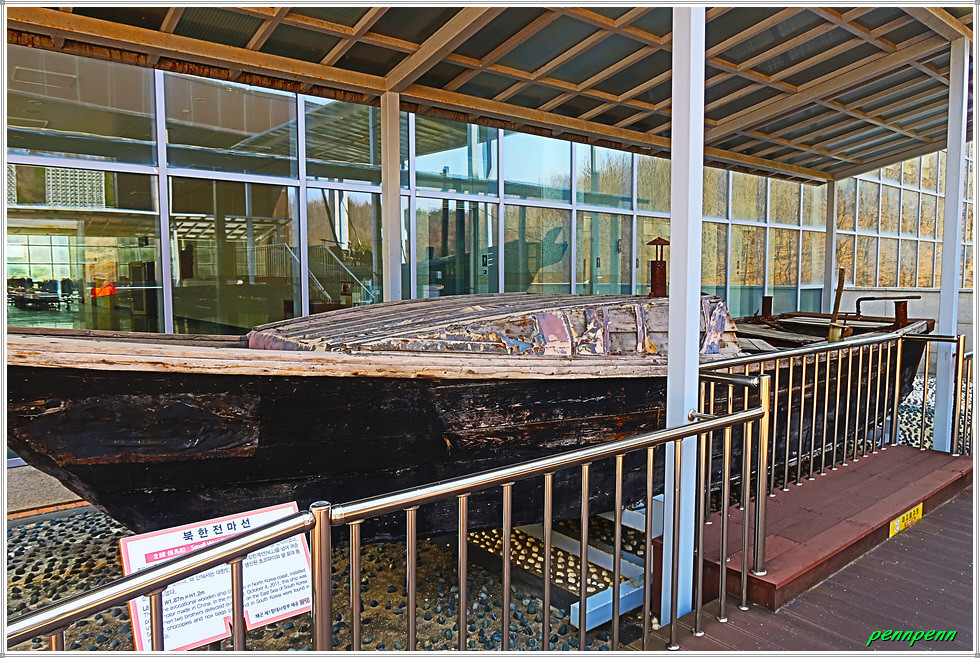 박물관건물 입구에는 북한이탈주민이 소지한 물품과 이들이 탈복하면서 이용한 선박(전마선)이 전시되어 있습니다. 전마선(傳馬船)은 큰 배와 육지 또는 배와 배 사이의 연락을 담당하는 작은 배를 말하는데, 선체가 작아서 해안 레이더나 열상감지장비에도 잘 보이지 않습니다. 이 배는 2006년 일가족 6명이 북방한계선(NLL)을 넘어 귀순할 때 사용했습니다.