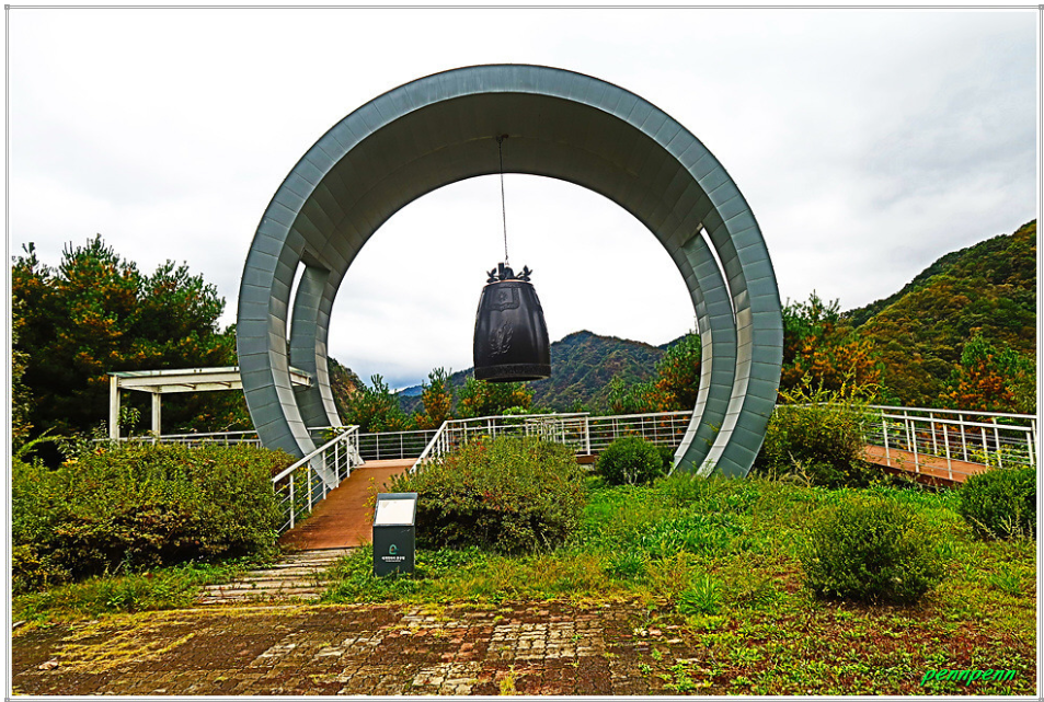 주차장에서 가파른 계단을 오르면 댐하류 전망대인데 이곳에 염원의 종이 있습니다. 염원의 종은 나무로 만들어진 침묵의 종입니다. 이 종은 세계평화의 종과는 달리 남북분단의 현실을 담아 울리지 않게 만들었다는 슬픈 이야기가 담겨 있습니다. 염원의 종이 침묵을 깨고 세계를 향해 울려 퍼지기를 기원합니다.