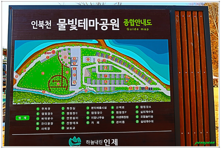 인제군 소화면 천도리 소재 인북천물빛테마공원은 도시의 소음에서 벗어나 맑은 공기와 초록의 풍경이 어우러진 곳, 사계절 내내 자연을 느끼며 쉴 수 있는 프라이빗 힐링 공간. 넓은 부지 곳곳에 분수, 수목, 정원, 공원, 놀이터 등 다양한 테마의 자연 공간이 조화를 이루고 있습니다. 이곳에는 캠핑과 카라반 사이트, 편의점, 감성카페, 수영장, 어린이놀이터, 바닥분수, 개인화장실과 샤워실 등의 각종 편의시설이 있어 휴식을 취하는데 불편함이 없는 곳입니다.