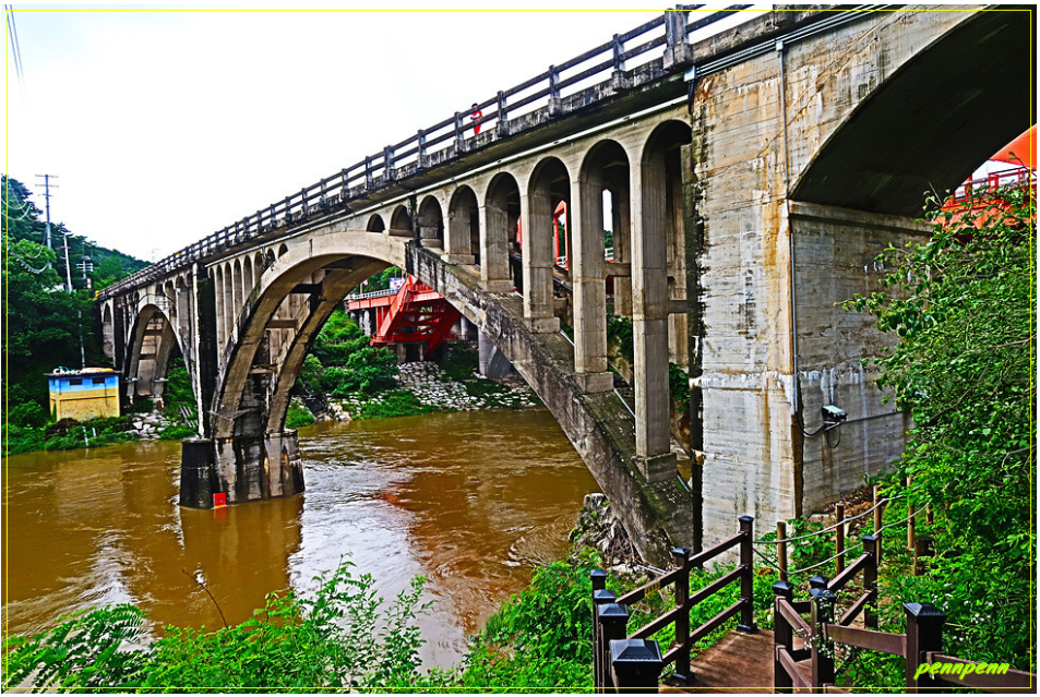 화천군 화천읍 대이리 소재 북한강을 가로지르는 꺼먹다리(근대문화유산)는 화천댐이 준공되면서 1945년에 건설된 다리로서, 나무로 만든 상판에 검은색 콜타르를 칠해 “꺼먹다리” 라는 이름이 붙었습니다. 화천수력발전소와 함께 당시의 산업을 엿볼 수 있는 시설물이며 건립 당시의 원형을 잘 간직하고 있어 근대 가구식 구조 교량사 연구에 중요한 자료로 평가받습니다. 한국전 당시 중동부전선을 연결시켜주는 중요한 교량이었기 때문에 전투도 치열했던 곳이며, 일제강점기 때에는 소양강과 화천간 모노레일을 이용해 물자를 수송했습니다.