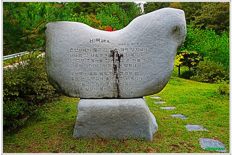 평화의 댐 경내에 있는 비목공원은 국민가곡 "비목"의 탄생지입니다. 1960년대 중반 평화의 댐 북방 14km 백암산 계곡 비무장지대에 배속된 한 청년장교는 잡초가 우거진 곳에서 이끼 낀 무명용사의 돌무덤 하나를 만납니다. 녹슨 철모, 이끼 덮인 돌무덤, 그 옆을 지키고 있는 새 하얀 산목련, 화약 냄새가 쓸고 간 깊은 계곡을 붉게 물들이는 석양. 그는 돌무덤의 주인이 자신과 같은 젊은이였을 거라는 깊은 애상에 잠겼습니다. <비목(碑木)>은 청년장교 출신 한명희의 시(작사)에 장일남이 곡(작곡)을 붙인 노래로 70년대 중반부터 널리 애창되기 시작해 불후의 가곡이 되었습니다.