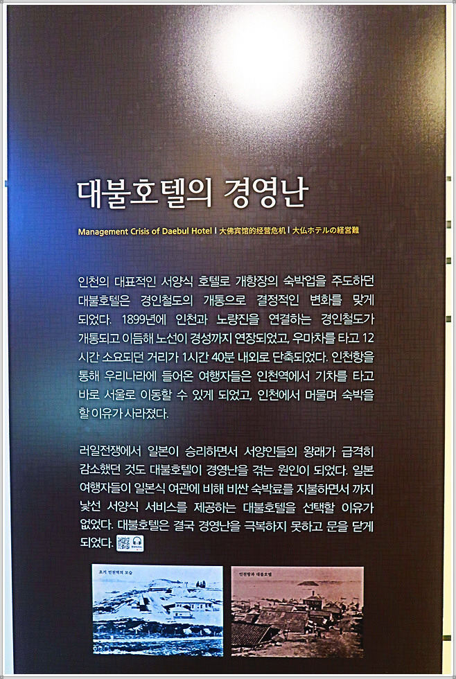 인천광역시 중구 신포로23번길 소재 대불호텔전시관은 우리나라 최초의 서양식 호텔인 대불호텔의 역사를 소개하는 전시관입니다. 대불호텔은 개항 후 인천항으로 들어오는 외국인들이 서울로 가기 전 묵었던 서양식 호텔로 당시 인기가 높았으나 경인선 개통과 러일 전쟁 후 서양인의 방문이 뜸해지자 점차 경영난으로 쇠락하여 문을 닫았습니다. 이후 중국인이 건물을 인수해 “중화루”라는 중국요리집으로 운영되다 철거된 후 복원해 2018년 전시관으로 다시 문을 열었습니다.