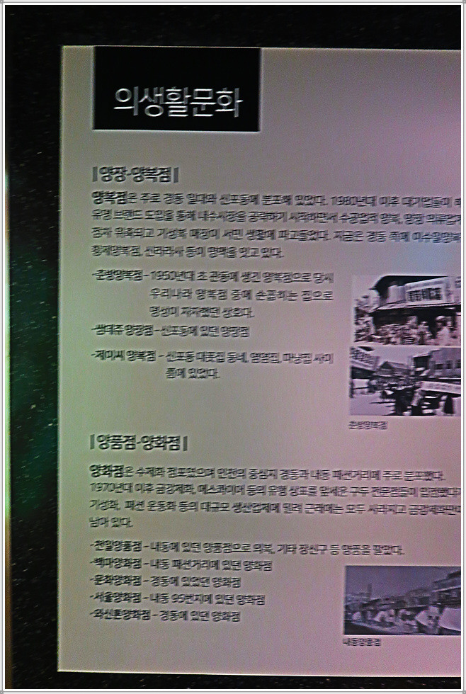 지상 1층 전시실은 1960~70년대 중구 생활상을 의식주 문화로 구획하여 전시하고 있습니다. 이곳에는 양장점과 양복점, 결혼식장, 주택, 음식점(경양식점, 빵집, 분식점, 해장국, 국일관) 등을 볼 수 있습니다.