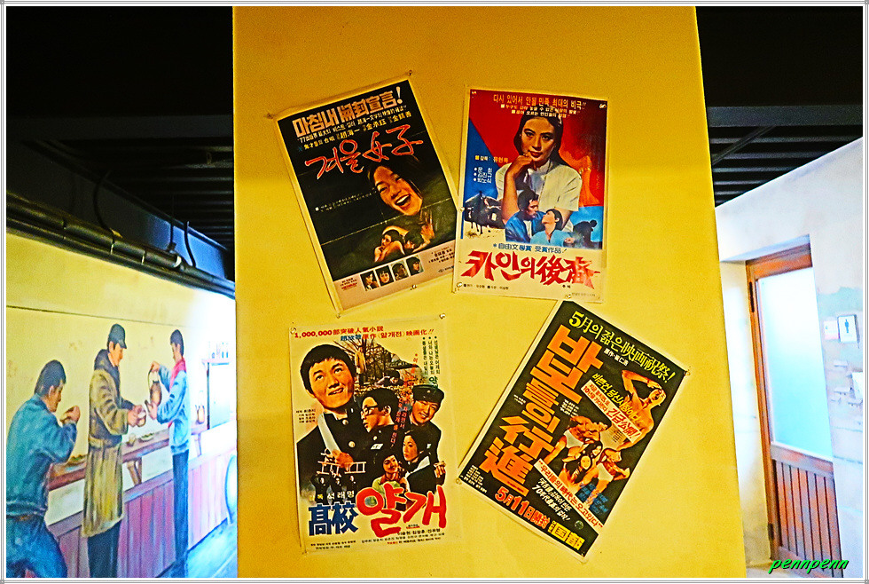 2층 전시실은 1960~70년대 문화 향유의 공간이었던 선술집, 극장, 다방 등을 볼 수 있습니다. 극장 앞에는 상영작 포스터가 붙어 있는데 당시 애관극장, 동방극장, 키네마극장, 시민관, 인영극장 등이 있었습니다. 한켠에는 고일상 기증유물전시관이 있군요.