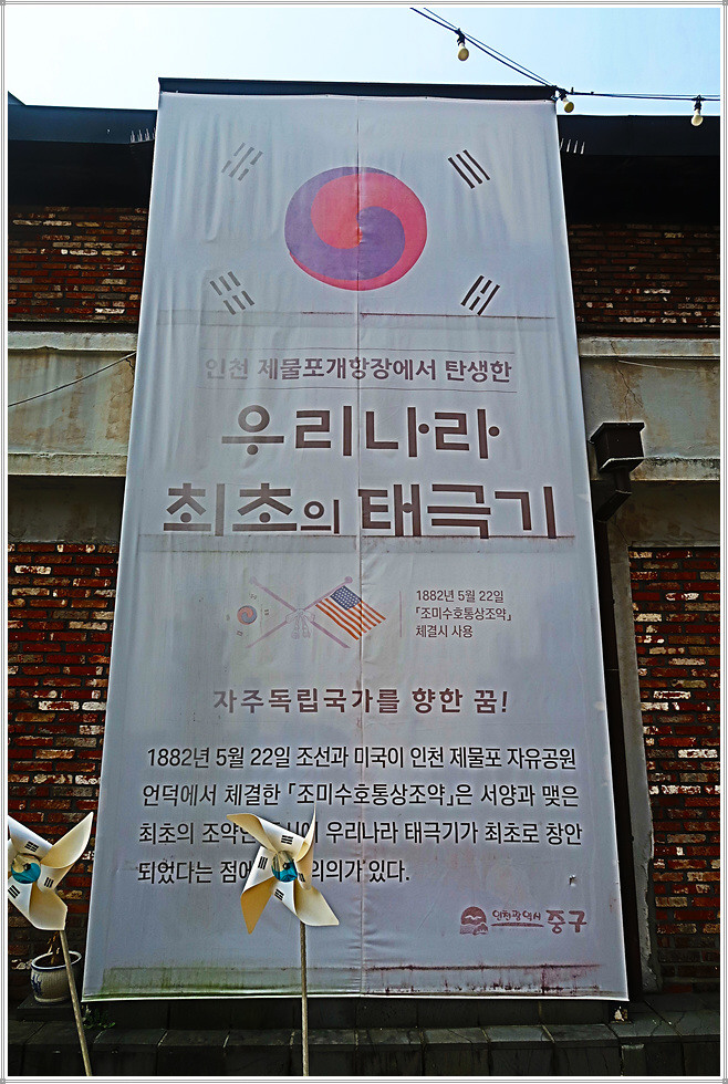 중구생활사전시관은 1960~70년대 인천 중구의 지역 변화를 기록하고 일상 생활사를 전시하는 공간입니다. 당시 주민들이 이용하던 다양한 점포와 생활공간을 실물 형태로 재현하여 관람객이 시대적 환경을 이해할 수 있도록 구성되어 있습니다. 전시 자료에는 의생활·주생활·상업 활동과 관련된 물품과 기록물이 포함되어 있으며, 시대별 생활 변화를 객관적으로 살펴볼 수 있는 자료가 마련되어 있습니다.(자료/대한민국 구석구석). 전시관 건물 외부벽면에는 우리나라 최초의 태극기가 걸려 있군요.