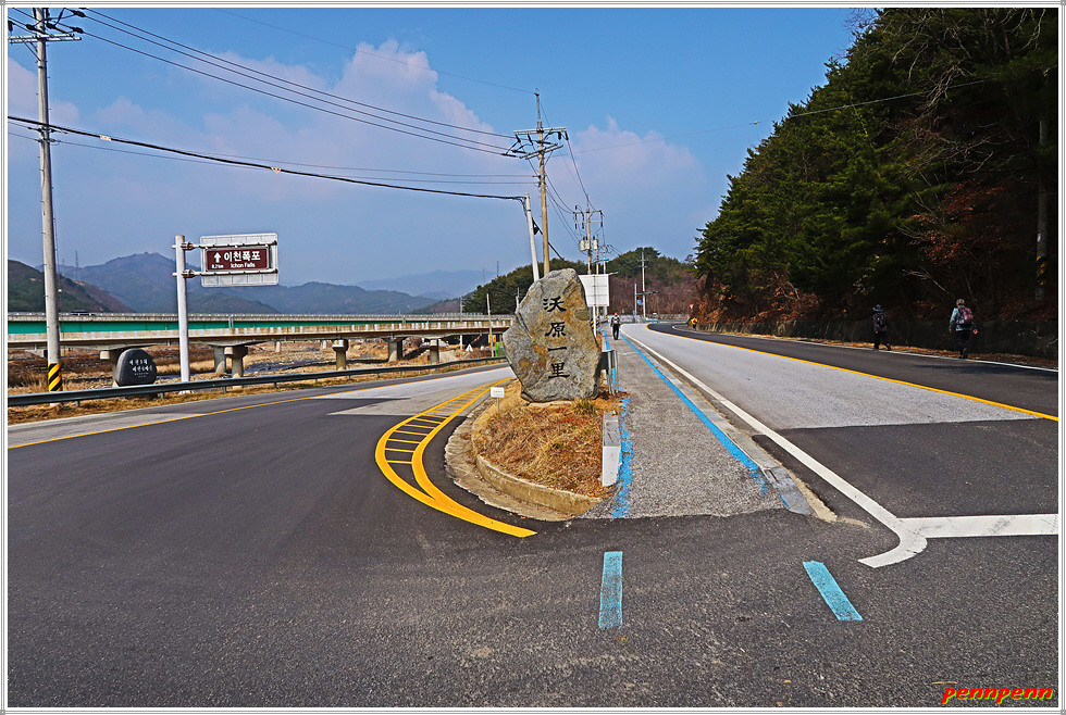 이제부터는 매우 지루한 도로길입니다. 호산천을 벗어나 갈곡천을 끼고 도는 이 길은 바로 이웃에 고속도로 뺨치는 세련된 7번국도가 내달리는 것으로 보아 아마도 옛 7번 국도일지도 모르겠습니다. 영광레미콘을 지나면 지붕이 태양열집열판으로 된 삼척그린파워 태양열 주택단지입니다. 조금 더 가니 좌측으로 소공대비 5.5km라는 이정표가 있는데요. 소공대비는 조선 세종 때 청백리 황희정승을 기리는 비석입니다. 그런데 이 길은 최초로 해파랑길을 조성할 때의 길로서 현재는 소공대비를 경유하지 않고 임원항 방면으로 바로 이어집니다.