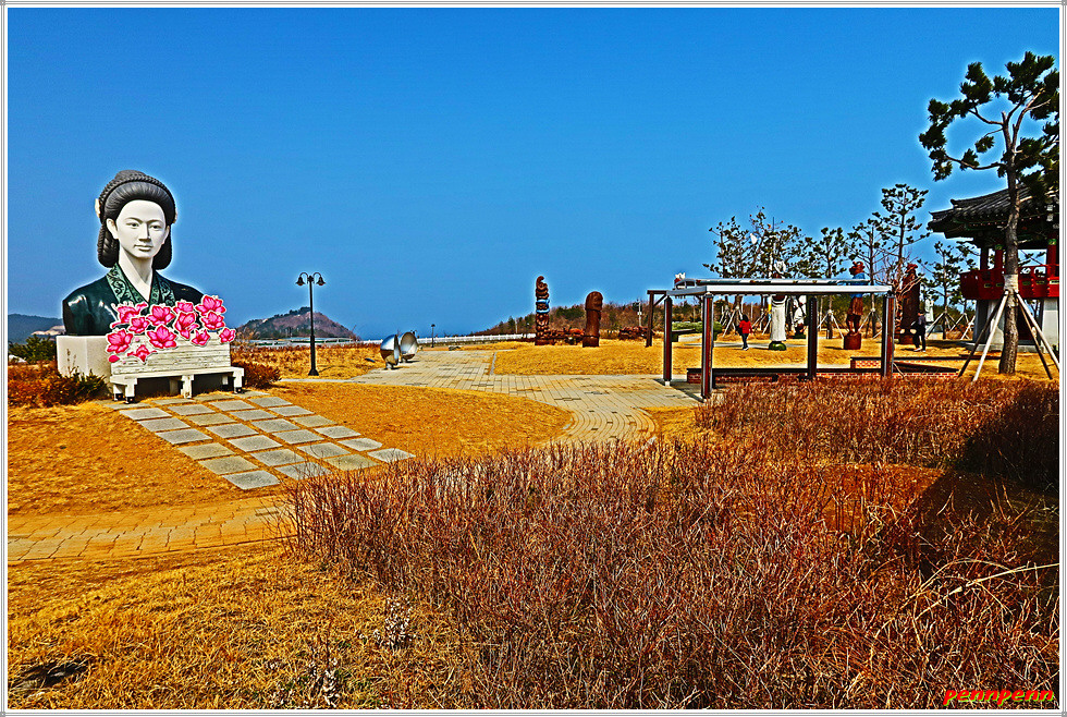 임원항교 앞에는 수로부인 헌화공원을 알리는 대현간판이 서 있는데요. 원해 해파랑길은 여기서 임원초등학교 방면으로 직진하지만 필자는 수로부인을 만나러갑니다. 최신형 엘리베이터를 타면 순식간에 공원입구인데요. 이곳에는 수로부인 조형물, 울릉도 전망대, 카페, 순정공(수로부인 남편) 조각상, 헌화정, 십이지신상 등 볼거리가 많은 공원입니다.