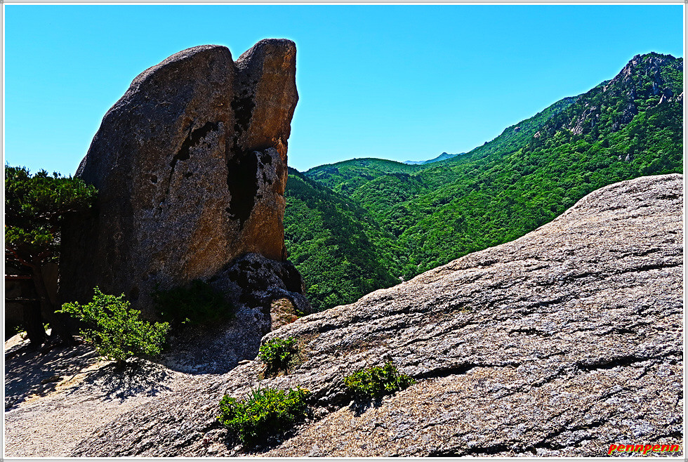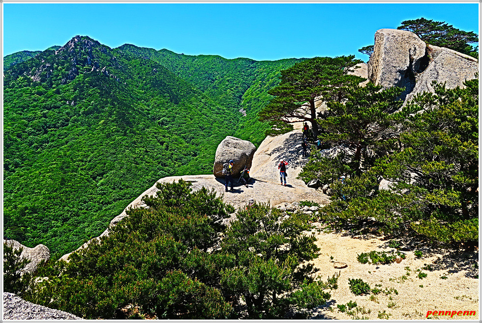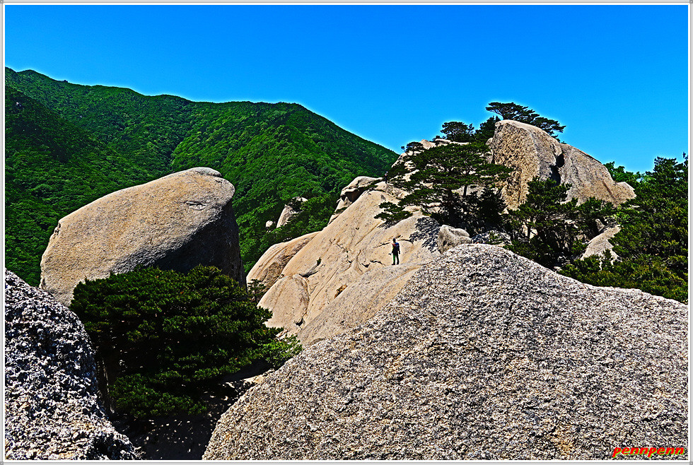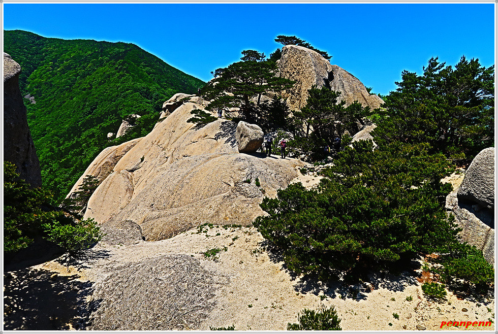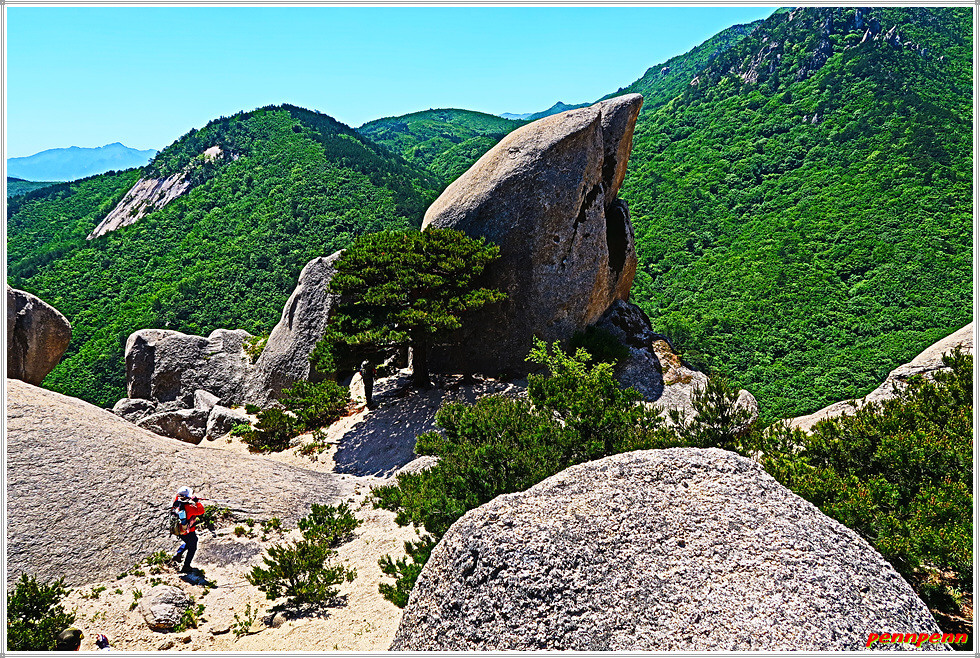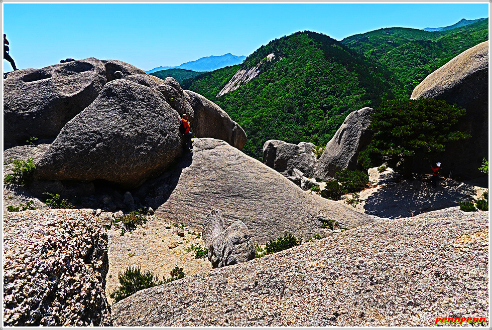 일단 큰 노송 사이를 통해 아래쪽 바위로 내려섭니다. 뱀바위봉 정상은 상당히 넓은데 기기묘묘한 기암이 주변에 널브러져 있어 구석구석을 살피며 기암과 주변풍광을 감상하는 재미가 매우 쏠쏠합니다. 북설악 능선의 바위봉암군은 신선봉 같은데 정확히는 잘 모르겠습니다.