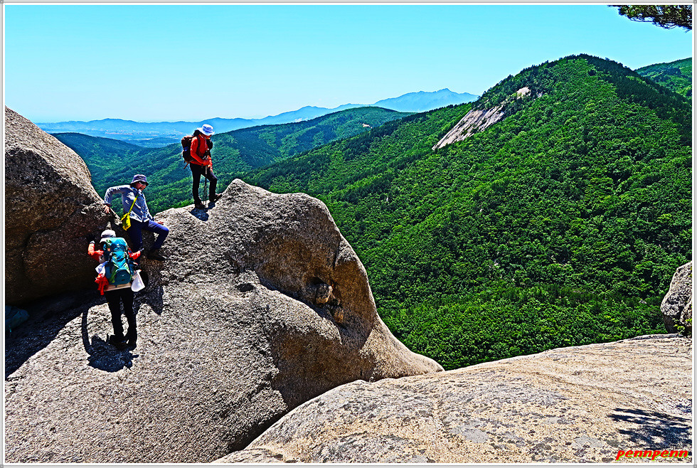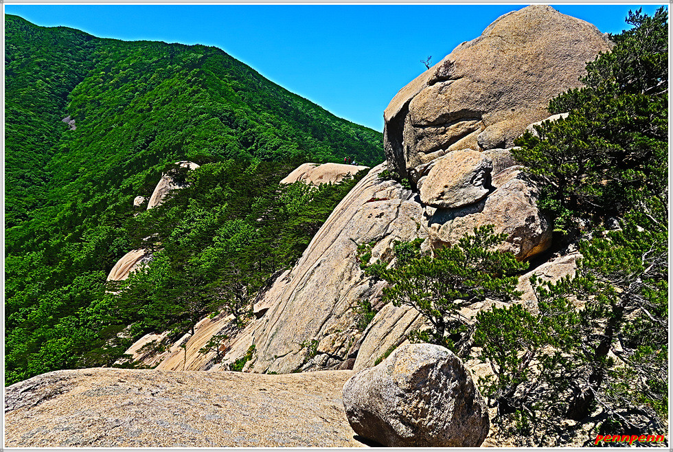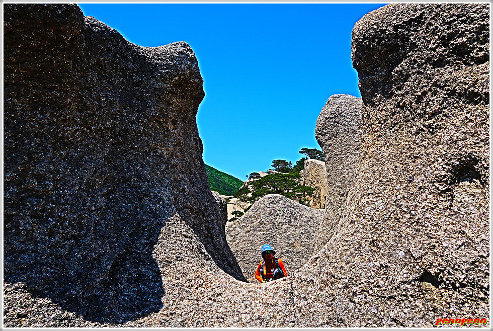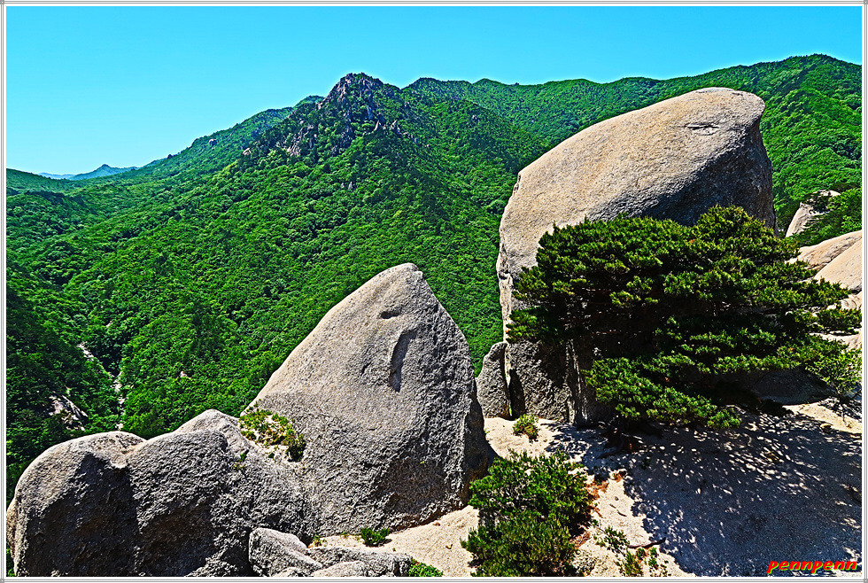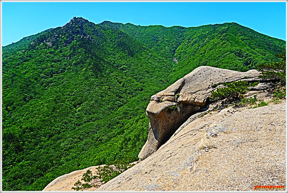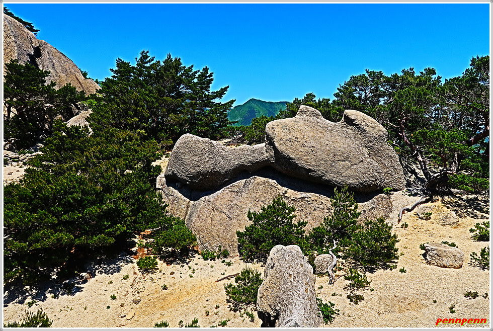 일단 큰 노송 사이를 통해 아래쪽 바위로 내려섭니다. 뱀바위봉 정상은 상당히 넓은데 기기묘묘한 기암이 주변에 널브러져 있어 구석구석을 살피며 기암과 주변풍광을 감상하는 재미가 매우 쏠쏠합니다. 북설악 능선의 바위봉암군은 신선봉 같은데 정확히는 잘 모르겠습니다.