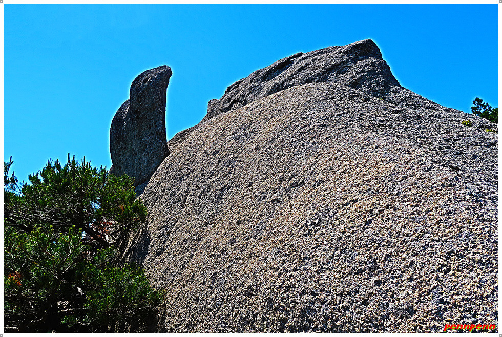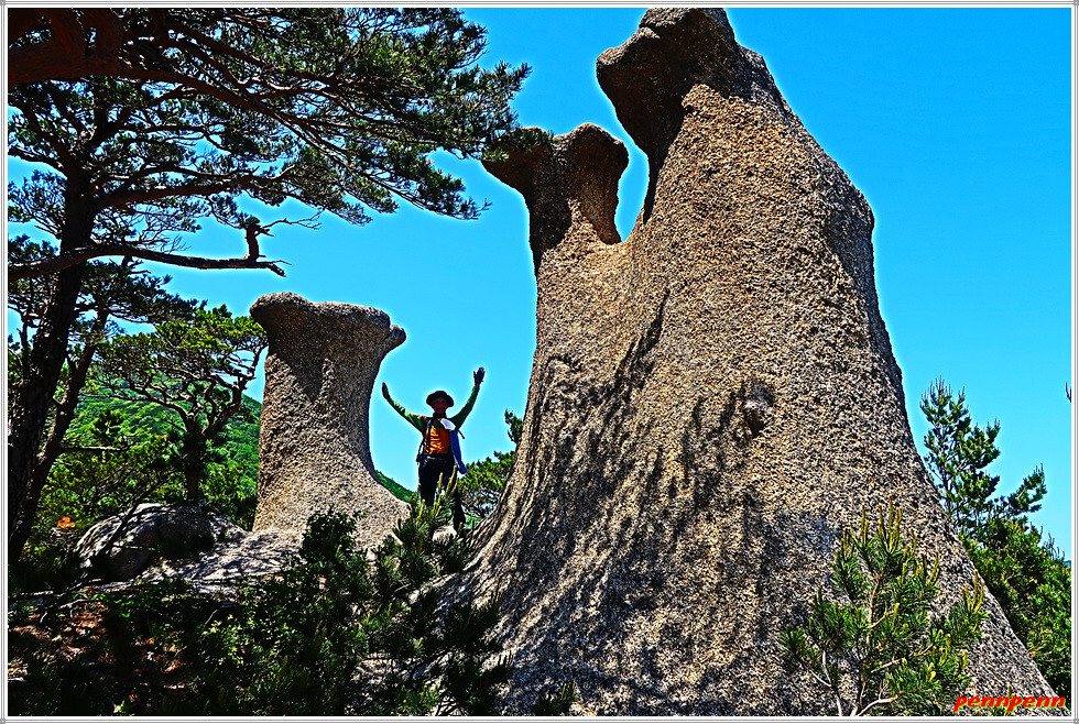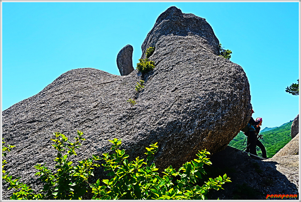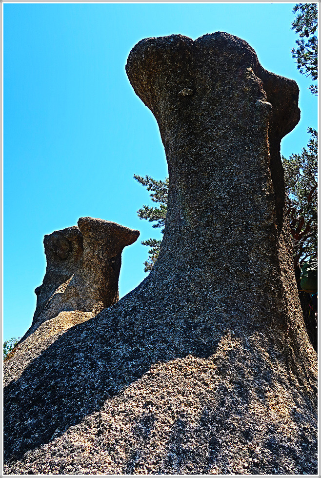 여기서 바위를 하나 넘어가니 뱀바위 능선 최고의 걸작바위가 나옵니다. 이른바 송이버섯바위입니다. 어찌 이런 바위의 모습이 생겼는지 모르겠습니다. 보는 각도에 따라 버섯처럼 보이기도 하지만 만화 고바우영감의 코 또는 앞발을 들고 있는 곰을 닮은 것 같기도 합니다.