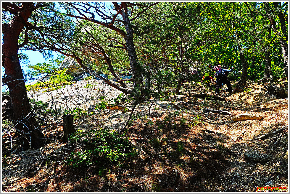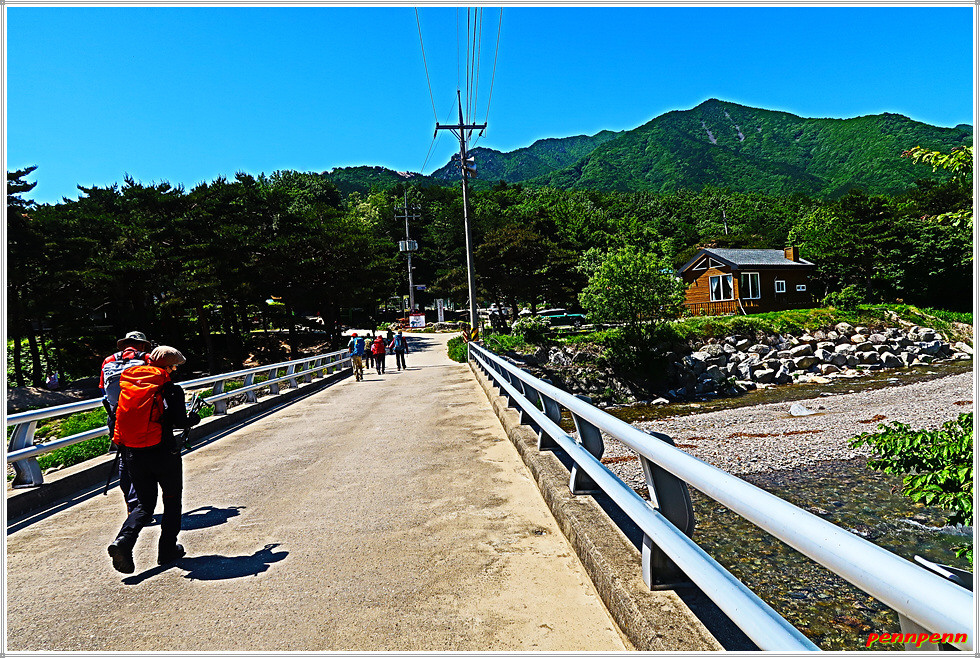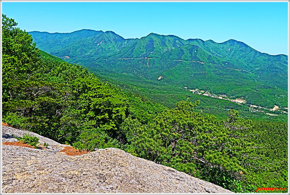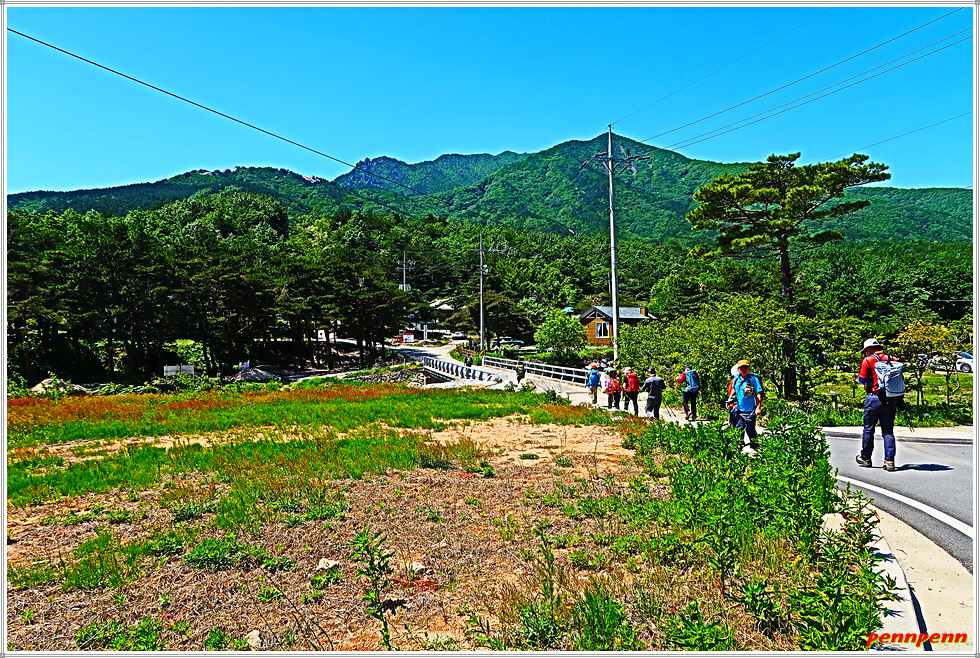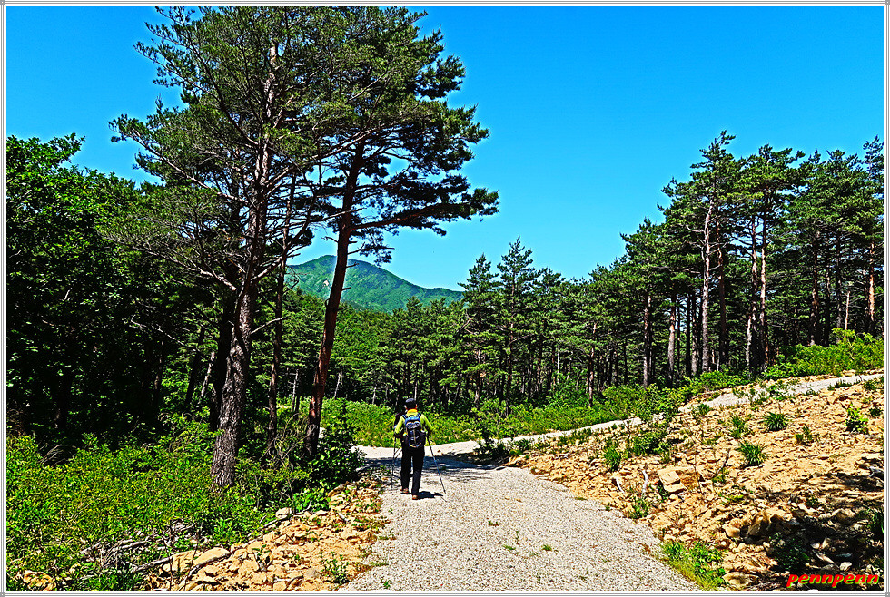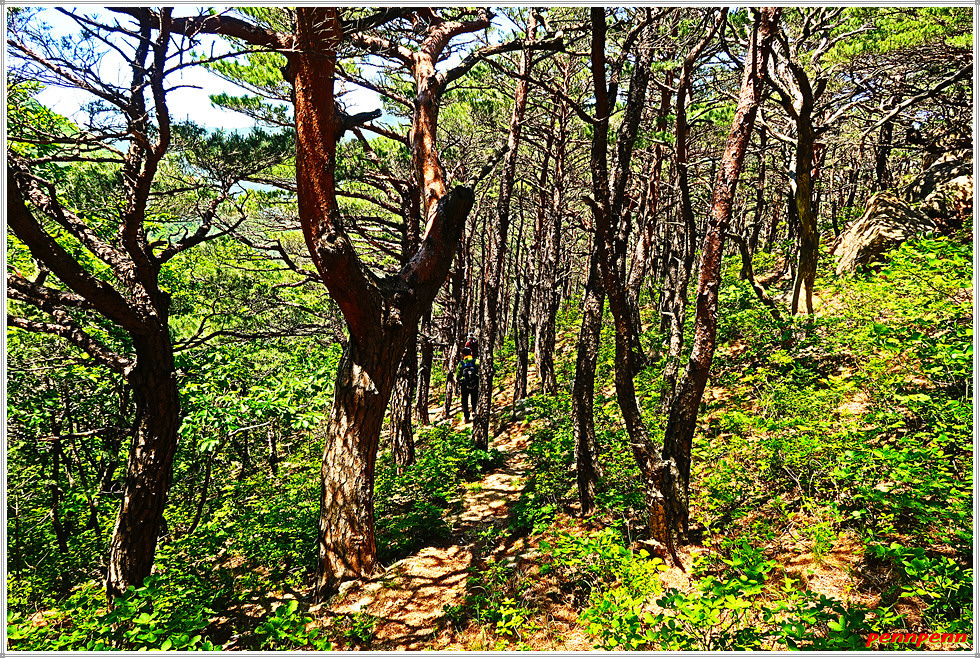 마당바위를 내려와 철조망 방향으로 되돌아가 좌측으로 하산합니다. 하산길이 매우 가파르지만 위험한 구간은 전혀 없습니다. 작은 폭포를 지나 고도를 낮추니 임도인데 그 주변에는 노송군락지입니다. 원터골천의 다리를 건너니 도원유원지의 대형주차장입니다.