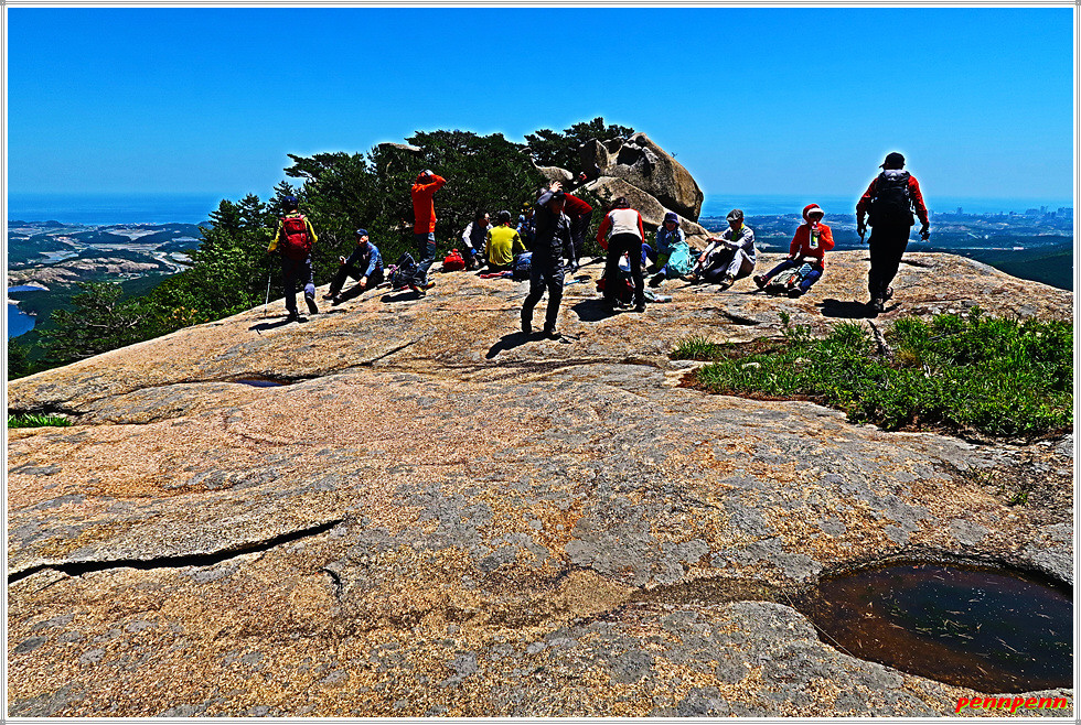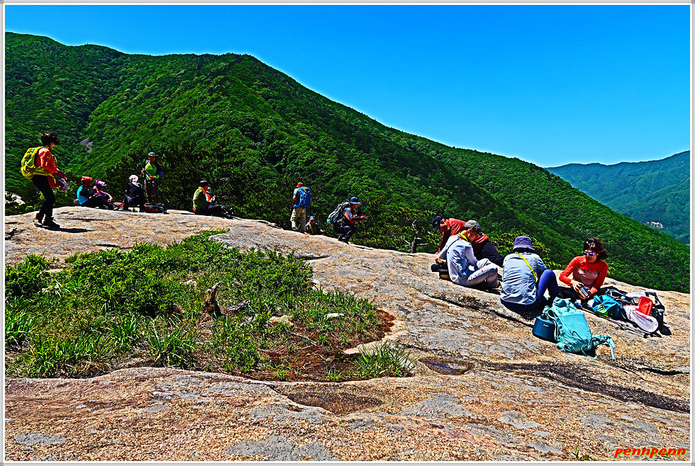 철조망을 헤치고 급경사를 내려서 큰 바위의 좌측으로 걸어가 넓은 바위로 오르면 바로 마당바위입니다. 바위가 엄청 크고 넓으며 조망이 매우 좋은 곳입니다. 순간적으로 세찬 바람이 불어와 모자가 날아갈 지경이지만 간식을 먹으며 쉬어가기 안성맞춤인 곳입니다.