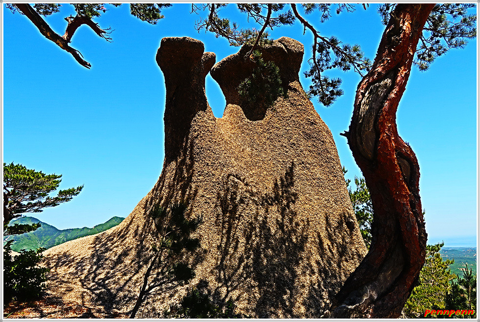 노송이 있는 곳으로 되돌아와 바위 좌측으로 오릅니다. 벼랑 끝 둥근 바위의 모습이 사람의 얼굴 같습니다. 약간 멀어져 본 얼굴바위는 오똑한 콧날이 그대로 드러날 정도로 진짜 사람얼굴입니다. TV조선 미스트롯 2 결승진출자(7명)의 하나인 가수 김의영이 미스트롯 1차경연에서 탈락한 후 “코를 세우고 재도전하게 되었다”는 소감으로 폭소를 자아냄과 동시에 솔직한 인물로 시청자들의 사랑을 듬뿍 받았는데, 이 얼굴바위(머리바위)도 마치 인공적으로 콧날을 세운 것 같습니다.