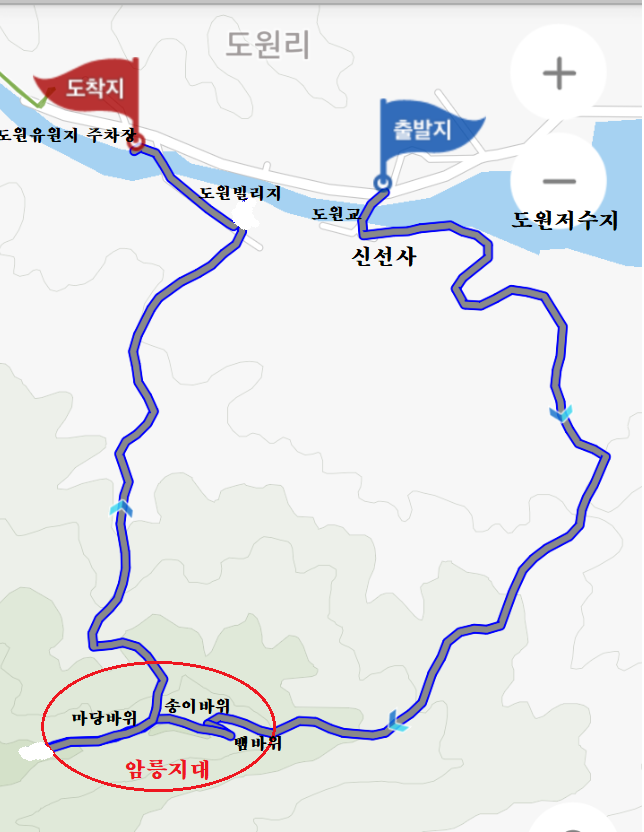 ▲ 코스 : 도원1리 경노당-원터천골 도원교-신선암-임도-신선교-뱀바위봉-마당바위
