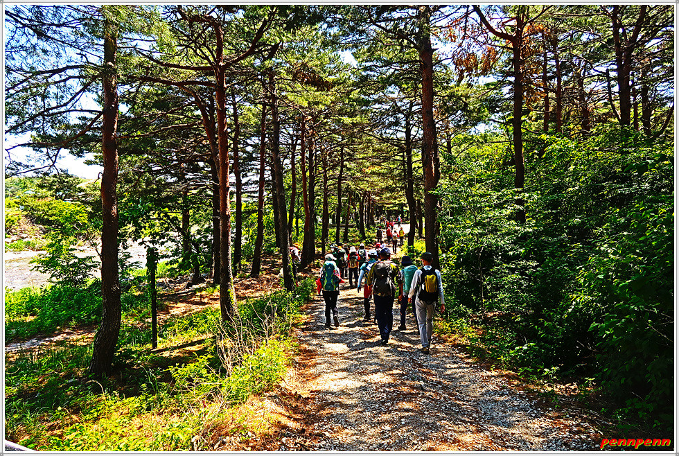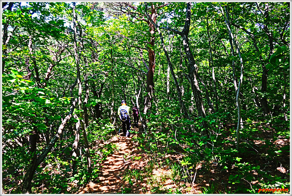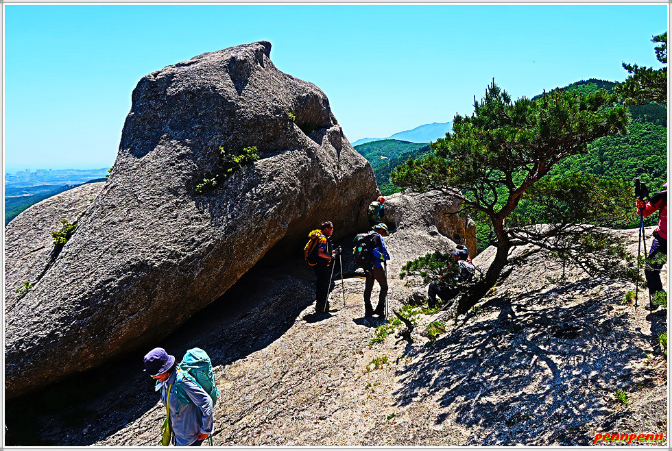 임도를 따라 가노라니 우측으로 길이 굽어지는데 신선교를 지난 후 임도를 버리고 우측의 산으로 진입합니다. 산 속은 이미 초록의 세상입니다. 점점 고도를 높이면서 소나무 군락지를 지나갑니다. 좌측의 벼랑에는 군부대의 철조망이 있어 그쪽으로는 접근이 안 됩니다. 큰 바위 사면을 돌아가면서 미끄러운 마사토길을 조심해서 오르니 거대한 암봉인데요. 산행을 시작한지 약 1시간 만에 드디어 뱀바위봉(435m)에 도착한 것입니다.