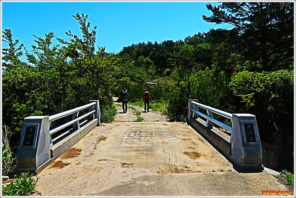 뱀바위봉 들머리는 도성면 도원1리 경노당 앞입니다. 이곳은 도원저수지 서쪽 끝자락으로 도원리계곡과 도원유원지가 시작되는 기점이기도 합니다. 원터골천에 놓인 도원교를 건너며 바라본 하천은 규모가 제법 크더군요. 다리를 건너 좌측으로 방향을 틉니다. 우측의 신선사는 개 짖는 소리가 요란해 그냥 지나쳐 쥐죽은 듯 조용한 임도를 걷습니다.