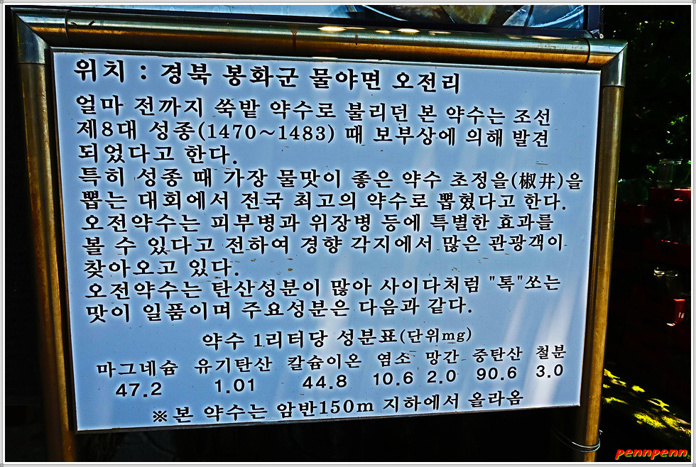 경북 봉화군 물야면 오전리 소재 오전약수는 조선 제9대 성종(1469-1494)때
