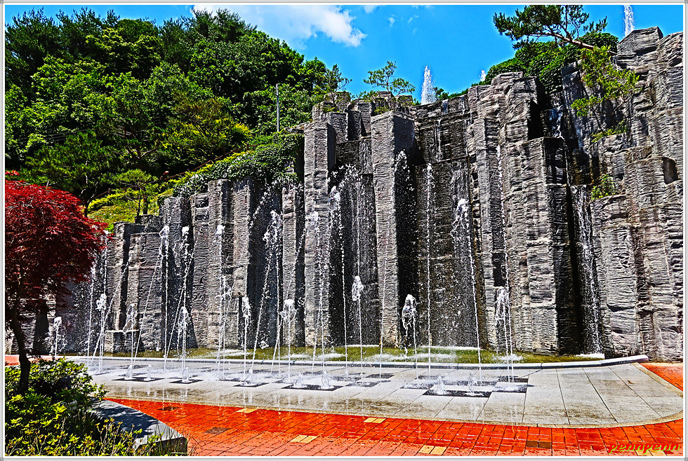 인공적으로 만든 주상절리 앞 분수대에서 시원한 물줄기를 뿜고 있더군요.