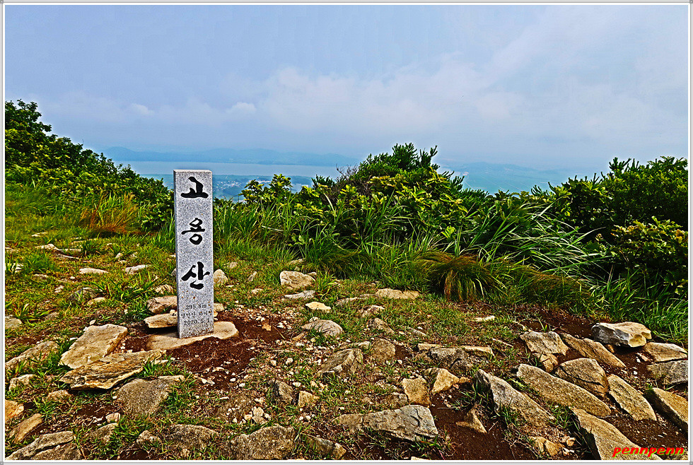 이곳을 지나면 드디어 고용산(296m) 정상입니다. 헬기장이 있는 넓은 정상에는 각기 모양이 다른 두 개의 정상표석이 있는데, 모범적인 표석으로 손색이 없습니다. 정상 남쪽 조금 전 보았던 성내저수지 방면으로 거침없는 조망이 펼쳐지네요.
