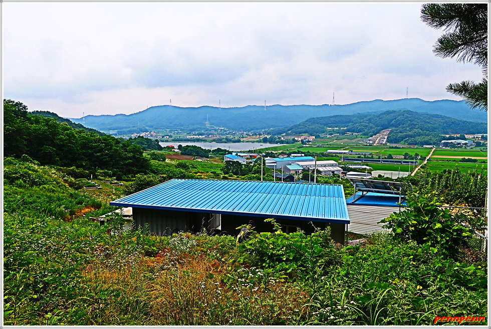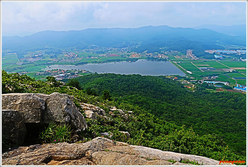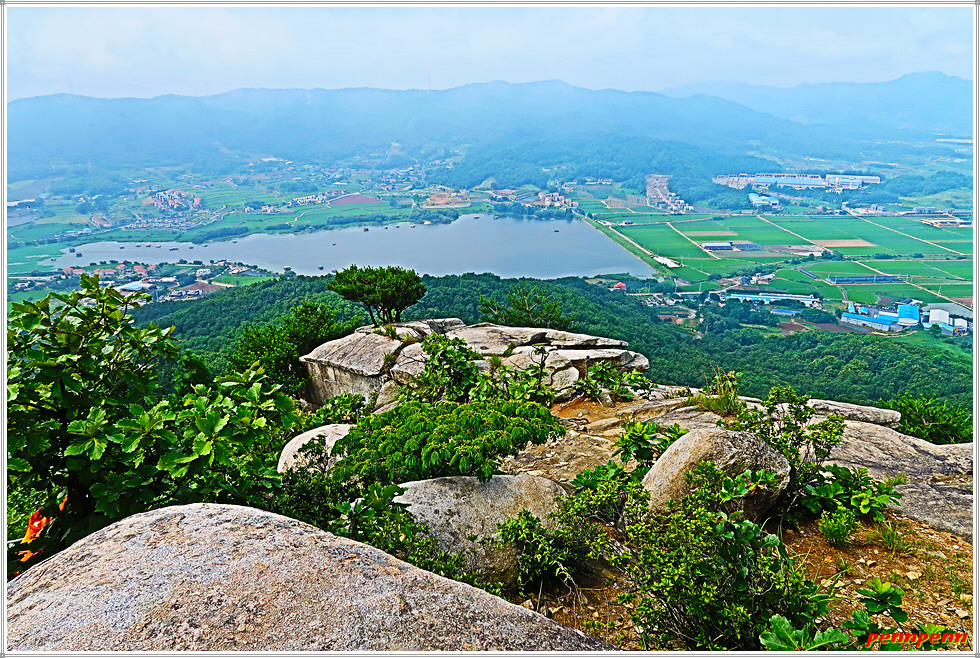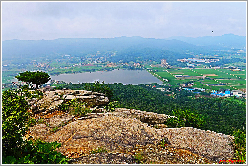 그러다가 암릉이 모여 있는 곳에 올랐습니다. 여기서는 성내저수지의 전체모습이 한눈에 들어옵니다. 저수지 하류에는 반듯한 농경지가 끝없이 늘어서 있고 그 뒤쪽으로는 이름 모를 산의 능선이 거대한 성벽을 이루고 있는 모습입니다. 암반 위에는 분재 같은 소나무 한그루가 자라고 있어 그야말로 한 폭의 산수화 같은 풍경입니다.