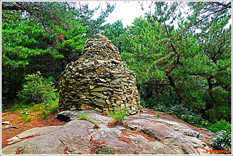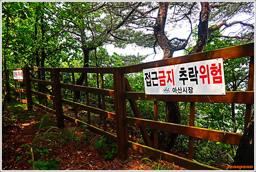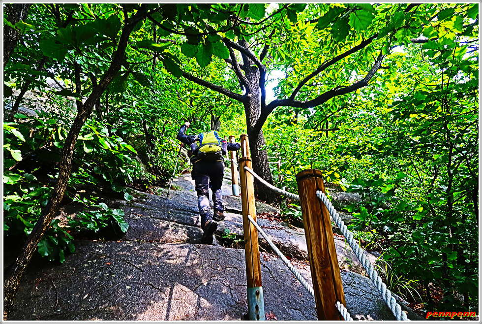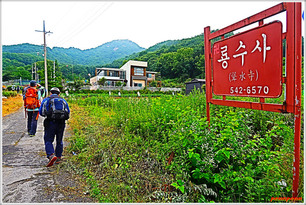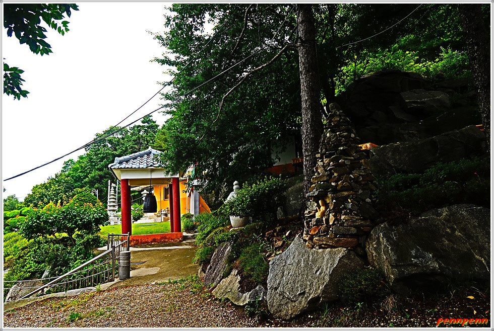 정상에서 고용사 방면으로 하산합니다. 넓은 평상을 뒤로하면 하산로 우측은 추락을 주의하라는 경고문이 자주 보이더군요. 삼거리 갈림길에서 고용사 쪽으로 방향을 잡습니다. 돌탑을 지나니 바로 마을이 보이고 그 우측이 고용사입니다.