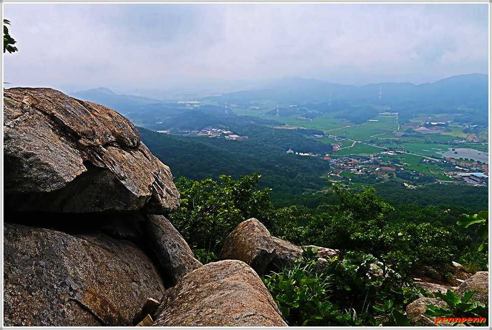 용수사 좌측으로 돌아갑니다. 여기서 정상까지의 거리는 980m로군요. 용수사 대웅전과 관리동을 보면서 호젓한 등산로를 오릅니다. 삼거리 갈림길에서 어느 방향으로 가든 정상으로 향하지만 우리는 직진합니다. 통나무계단을 지나 평지를 조금 걸어가면 큰 바위지대인데요. 여기서 뒤돌아보면 영인면의 산과 들이 시원하게 보입니다.