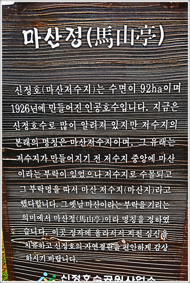 신정호로 많이 알려져 있지만 본래의 명칭은 마산저수지라고 하는데요.