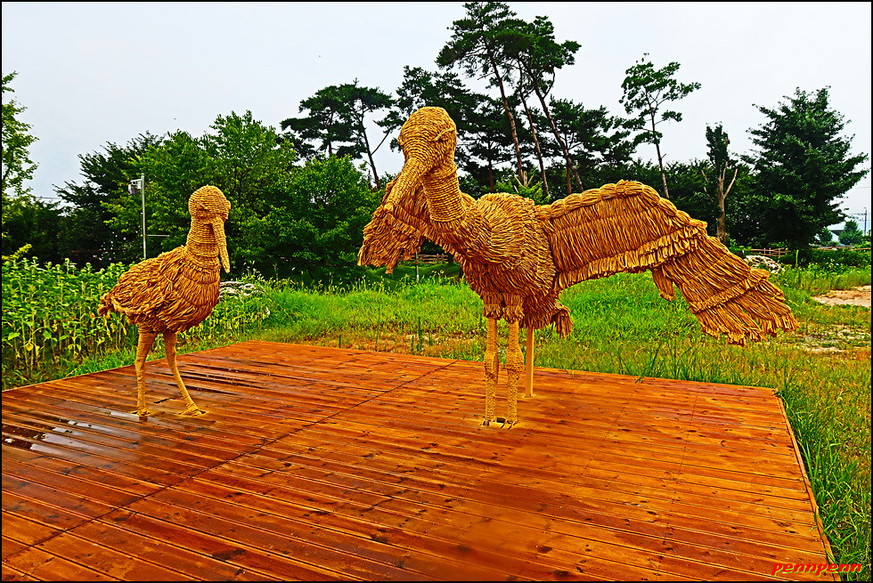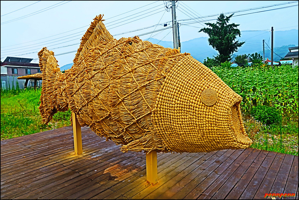 볏짚으로 만들었지만 매우 정교한 붕어형제와 황새부부
