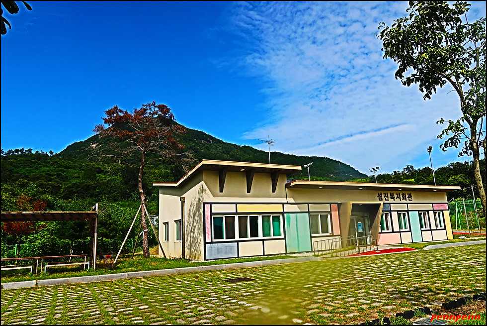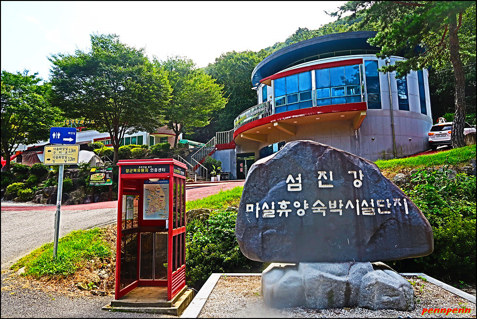 당산나무 쉼터를 뒤로하면 도로는 섬진강 옆으로 이어지는데, 강바닥에 놓인 큼직한 돌 하나가 보는 각도에 따라 여러 가지 동물의 형상을 상상하게 만듭니다. 가는 방향에서 볼 때는 바다사자처럼 보였는데 잠시 후 뒤돌아보니 곰 한 마리가 웅크리고 있는 모습처럼 보이기도 합니다. 앞쪽으로 하늘길이 있는 용궐산의 대슬랩바위가 허연 속살을 드러내고 있습니다. 육노정(六老亭)을 지나면 용궐산 치유의 숲이 있는 큰 건축물이 방문객을 맞이합니다. 건축물 앞 소형차 주차장에는 빈자리가 없을 정로로 자동차가 빼곡하게 주차되어 있더군요.