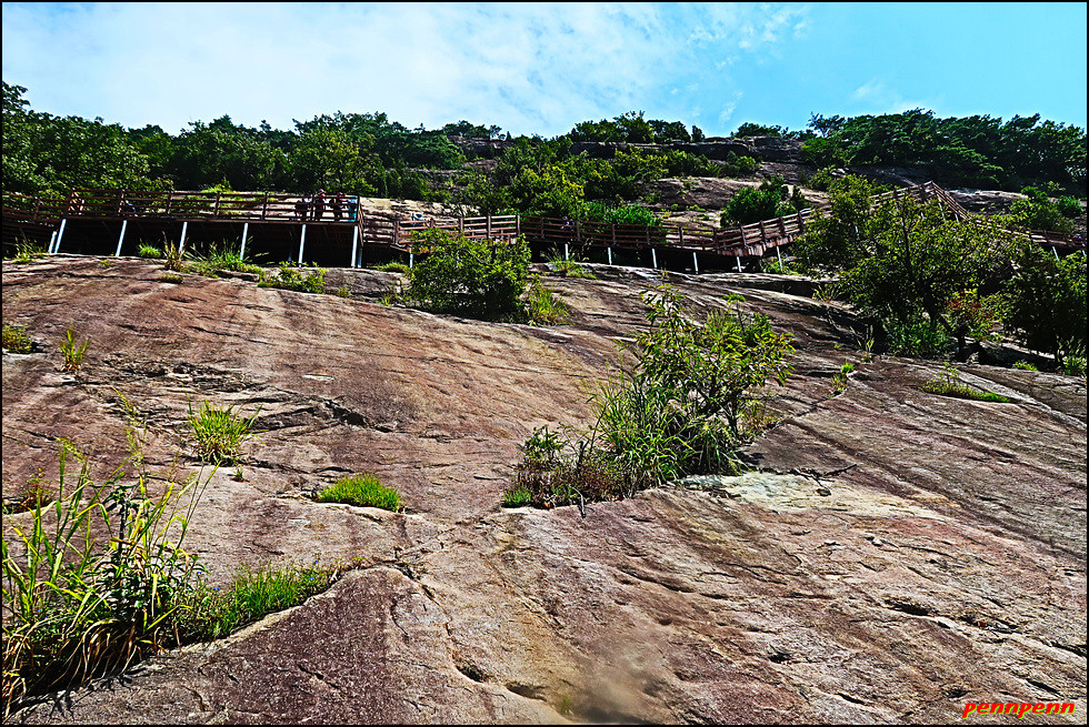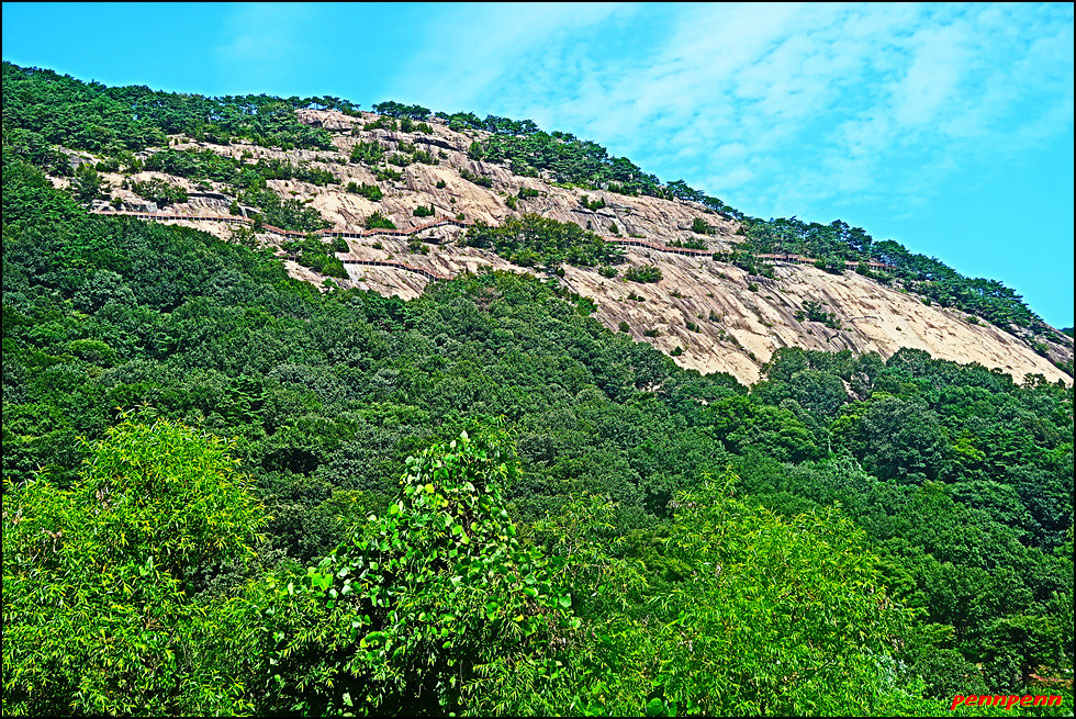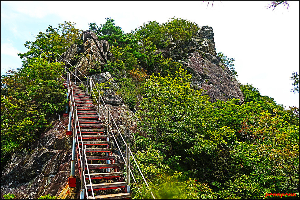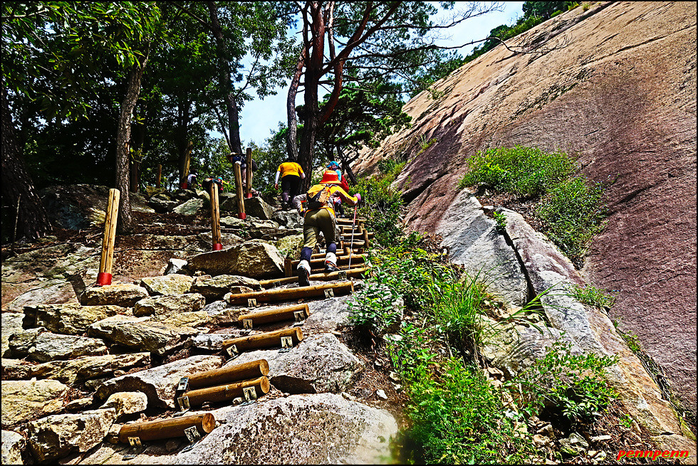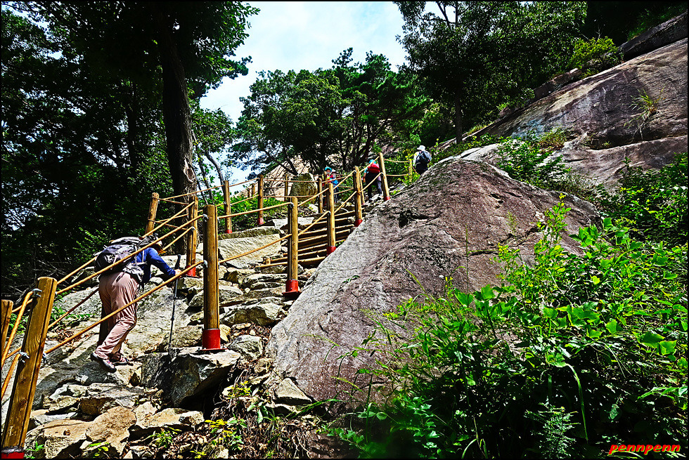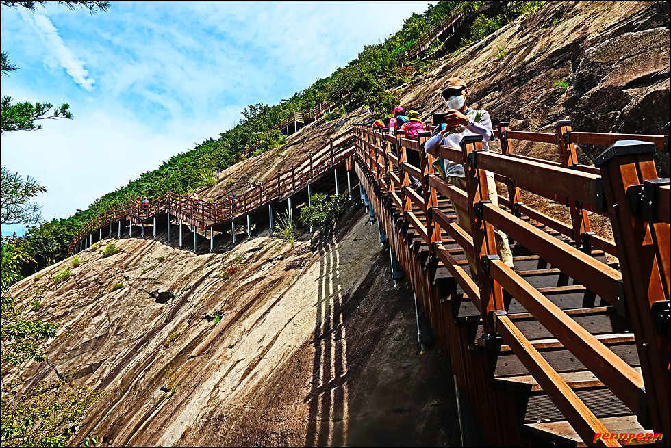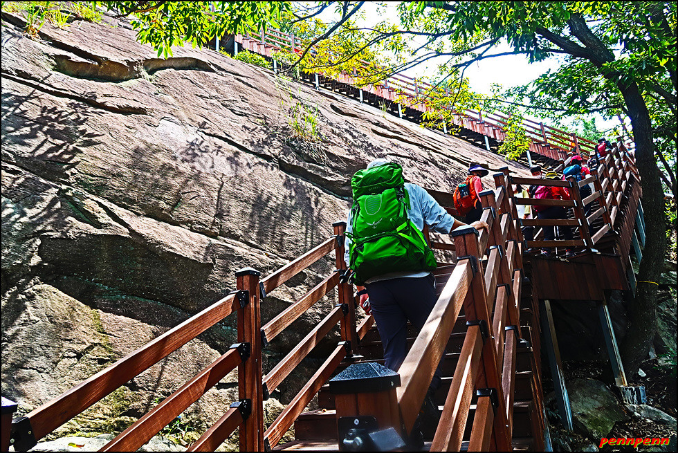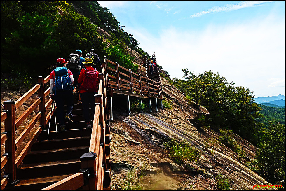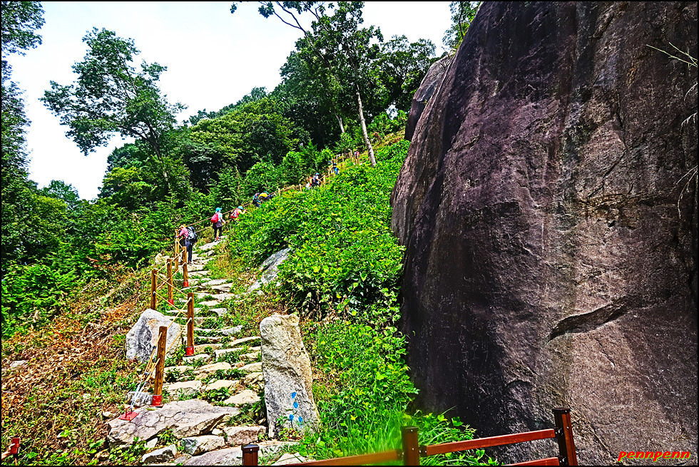 하늘길 등산로 입구는 건축물 우측에 있는데 돌로 만든 계단이 상당히 길게 이어집니다. 조금 오르면 계단길은 대슬랩아래 쪽에서 비스듬하게 점점 가파르게 고도를 높이게 됩니다. 오늘이 일요일(광복절)이어서 그런지 이미 하늘길을 올랐다가 내려오는 사람들도 제법 보입니다. 고도가 매우 가팔라 돌계단을 오르는 게 쉬운 일이 아니어서 노약자들은 조심해야 할 것입니다. 돌계단을 오르고 또 올라도 끝이 보이지 않더군요. 계단으로 가다가 평지를 조금 가면 다시 오르막인데요. 연이어 통나무계단과 돌계단을 오르면 드디어 데크로드가 시작됩니다. 지나온 돌계단 길이 자그마치 600m라고 하니 하늘길을 탐방하려는 이들은 마음의 각오를 단단히 해야 할 것입니다.