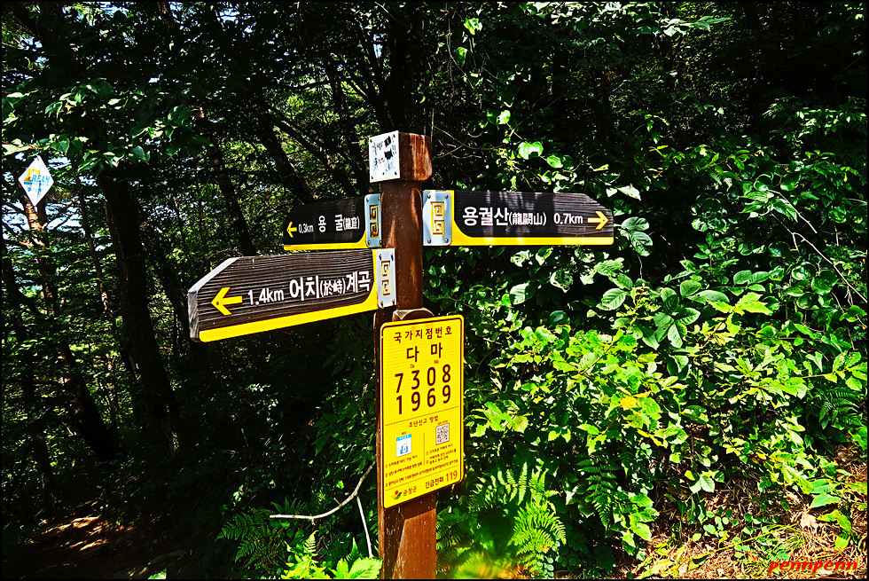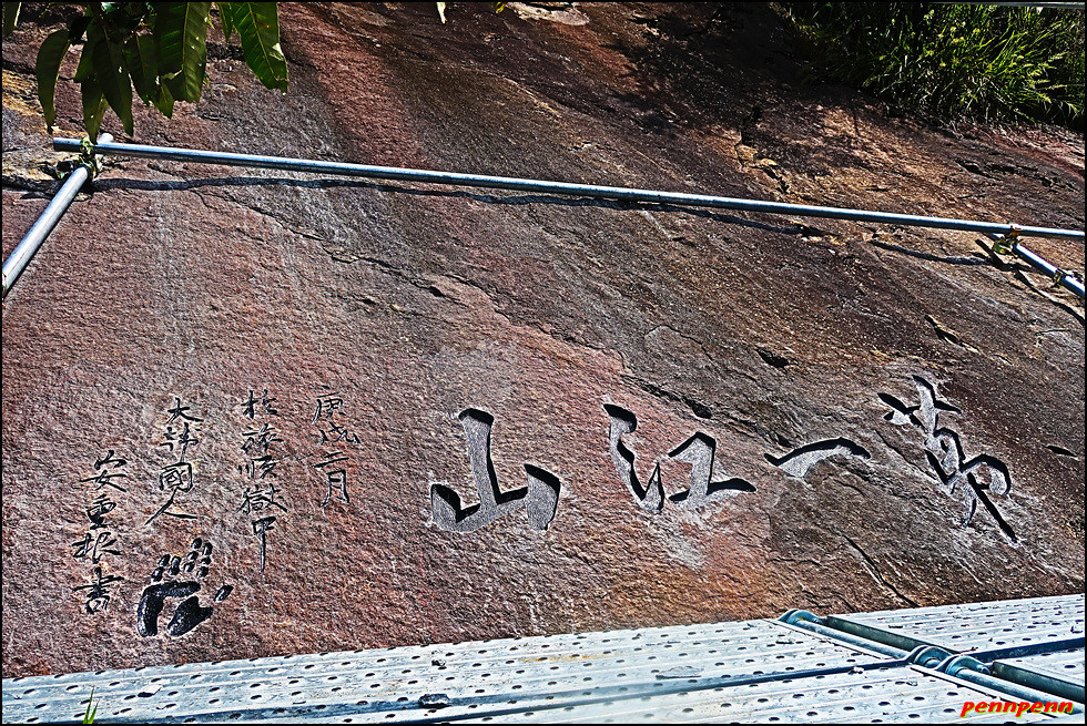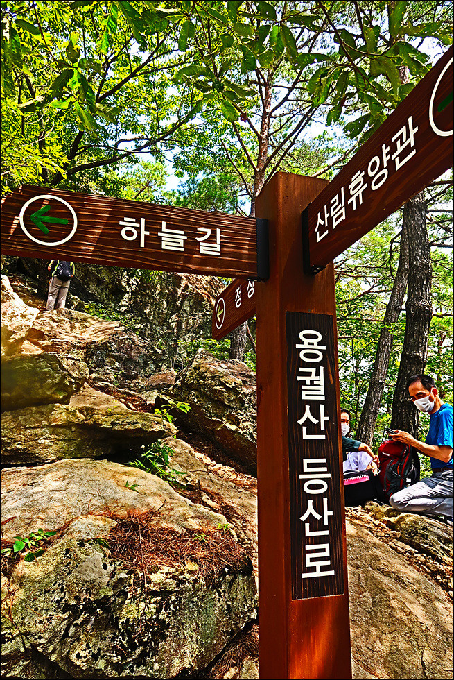 길목에는 바위사면에 음각형식으로 새긴 한자글씨(서각)가 있는데 이를 두고 산꾼들 사이에 비판이 많다고 합니다. 사실 중국의 5대 명산인 태산을 가보면 정상부의 주변 바위사면에는 소위 방귀깨나 낀다는 선인들과 권세가들이 새긴 글씨(서각)가 지저분할 정도로 많음을 목격했습니다. 그런데 하늘길의 서각을 보고 네티즌들은 천혜의 자연환경에 체제선전을 목적으로 하는 중국이나 북한처럼 서각을 하는 게 어불성설이라고 한다는군요. 현재까지 이곳에서 목격한 글씨는 이 외에도 지자요수 인자요산(知者樂水 仁者樂山), 안중근 의사의 제일강산(第一江山) 등입니다. 순창군에서는 전국 어디에서도 볼 수 없는 용궐산만의 차별화된 “고사성어 탐방로”사업계획의 일환으로 역사적인 인물의 글씨 또는 유명한 고사성어(故事成語)를 저명한 서예가의 글씨로 새기는 것이라고 해명했답니다.