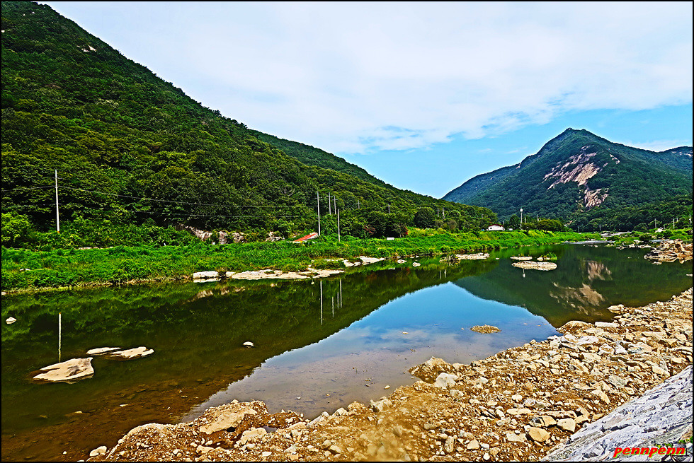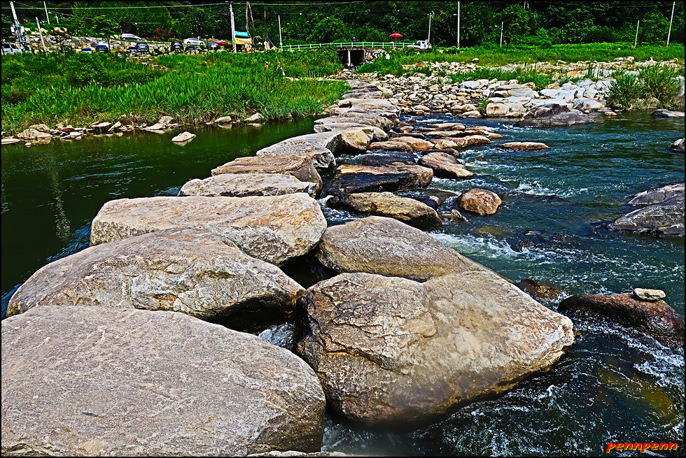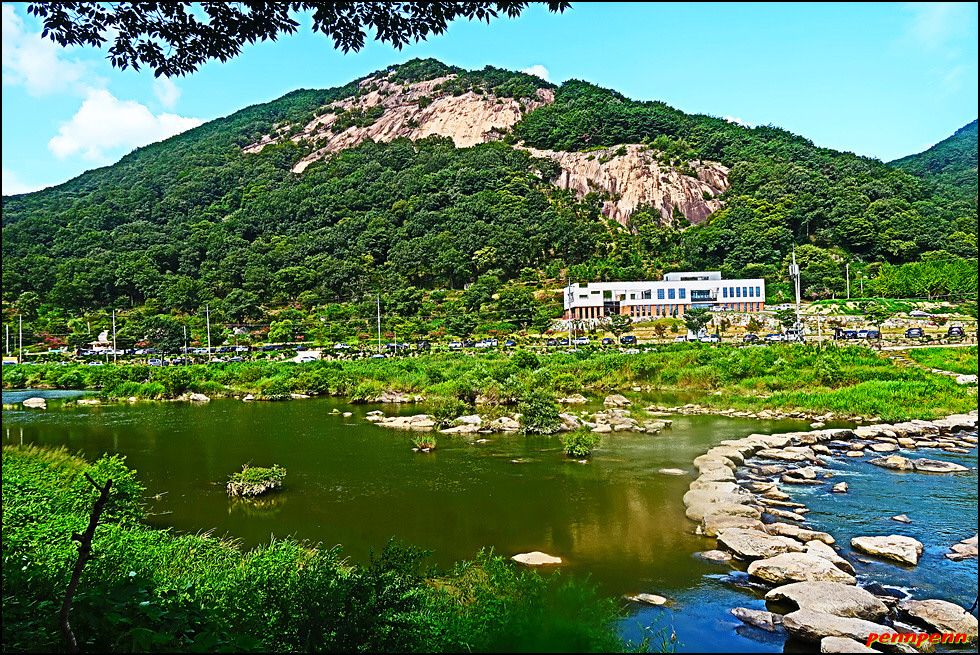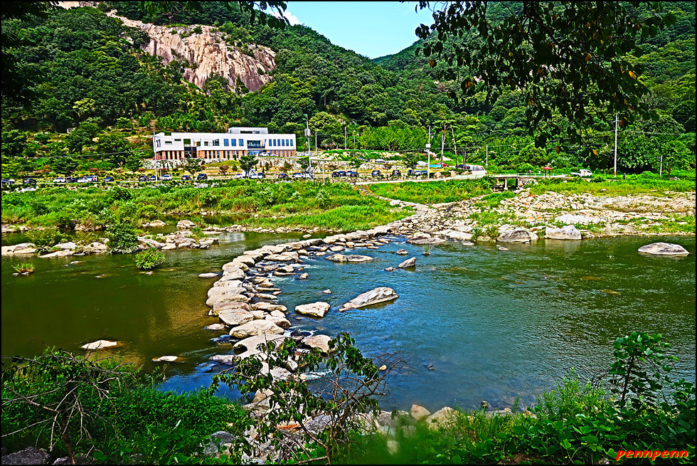 휴양시설 앞 섬진강에 놓인 징검다리를 건너갑니다. 징검다리가 매우 튼튼하게 놓여 있어 안심하고 이용할 수 있습니다. 그간 가물어서인지 섬진강 수량이 부족한 듯 보이네요. 맞은편 하늘길 입구인 치유의 숲 건축물 뒤로 하늘길이 손에 잡힐 듯 보입니다. 징검다리를 건너 우측의 섬진강변 도로를 따라 갑니다. 시간은 오후3시경이라 내리쬐는 태양열을 온몸으로 받으니 정말 무덥습니다. 아침에 출발했던 섬진복지회관 앞에 도착하니 등산버스가 기다리고 있습니다.