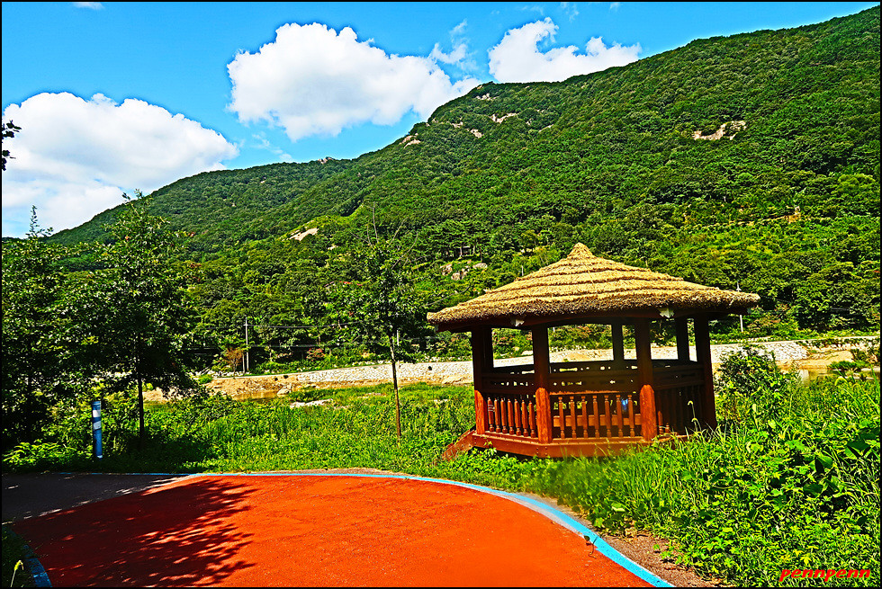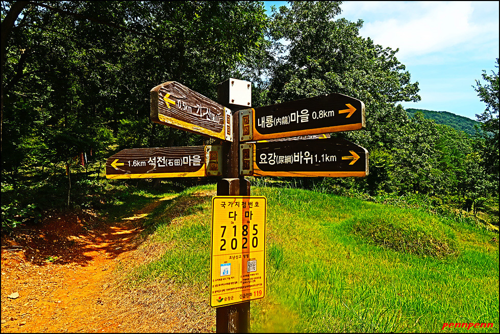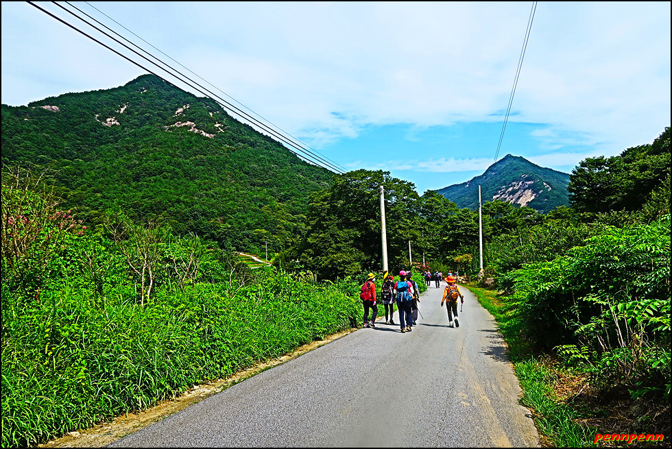 용궐산의 들머리는 정상 남쪽 섬진강변 치유의 숲 주차장인데, 이곳은 소형차만 진입이 가능해 대형버스는 여기서부터 남쪽으로 약 1.5km 정도 떨어진 섬진복지회관 앞까지만 운행이 가능하더군요. 물론 여기도 정식 주차장이 있는 게 아니라 도로변에 임시로 차를 세울 수 있습니다. 주차장문제로 인해 무더위에 왕복 약 3km를 더 걷게 되었지요. 북쪽으로 이어진 좁은 차도를 걷노라니 주차장으로 가는 승용차들이 계속 운행해 보행자도 운전자도 모두 불편한 동거가 계속됩니다.