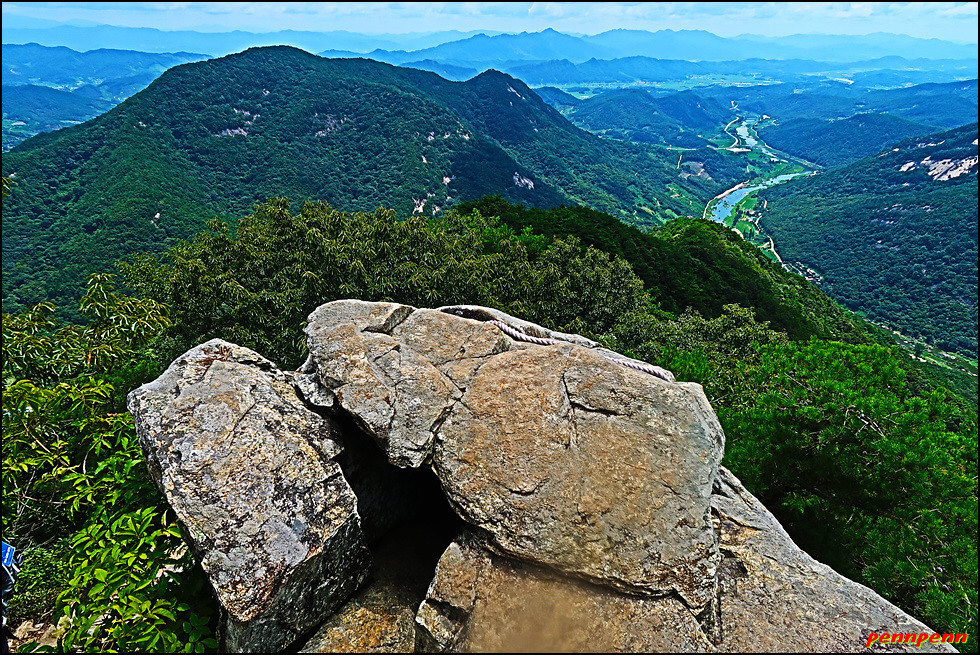 정상에 서니 그야말로 일망무제(一望無際, 한눈에 바라볼 수 없을 정도로 아득히 멀고 넓어서 끝이 없음)의 조망이 펼쳐집니다. 남서쪽에는 요강바위가 있는 섬진강변의 내룡마을이 내려다보이고, 남동쪽으로 무량산 뒤로 이름 모를 산그리메가 하늘금을 그립니다. 북쪽으로도 산봉이 바다처럼 넘실거림니다.