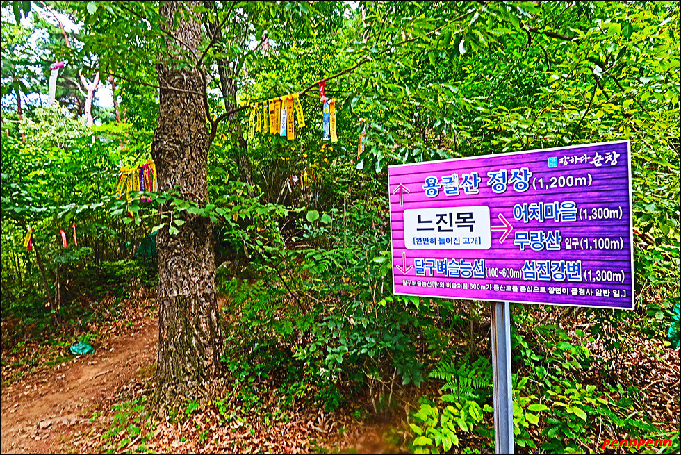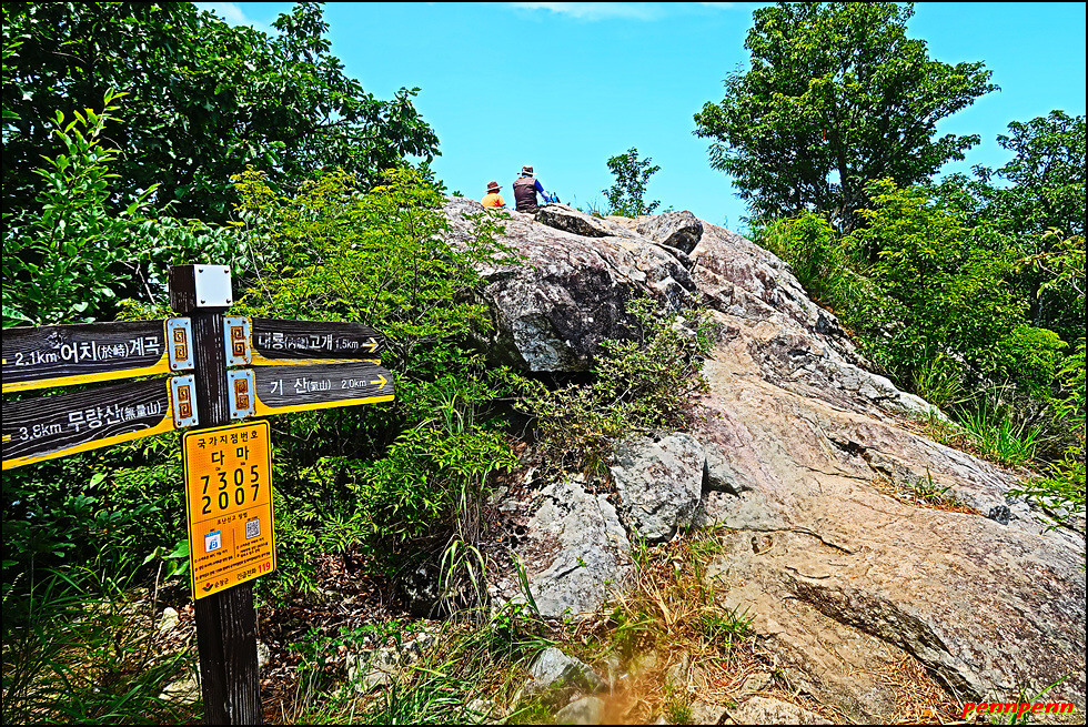 암릉길을 지나 평탄한 소나무숲길을 걸어가니 느진목(완전히 늘어진 고개)입니다. 이곳은 남남동쪽의 무량산으로 가는 갈림길인데, 여기서 정상까지는 아직도 1km를 더 가야 하네요. 통나무계단을 지나 약 300m를 오르니 이번에는 된목입니다. 좌측 약 300m 지점에 용굴이 있다는 이정표가 보이지만 이곳을 왕복할 엄두를 내지 못합니다. 기상청 예보에 의하면 이곳의 낮 최고기온이 섭씨 27도라고 했음에도 너무 더워서 땀이 비 오듯 흐릅니다. 보통 이런 능선에는 시원한 바람이 부는 게 일반적인데 웬일인지 바람 한 점 없어 산꾼들을 힘들게 합니다. 능선 우측 고사목 옆으로 어치마을이 내려다보이네요.