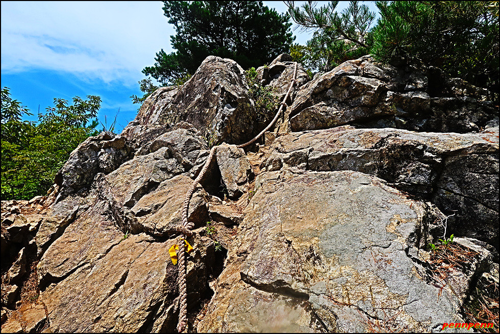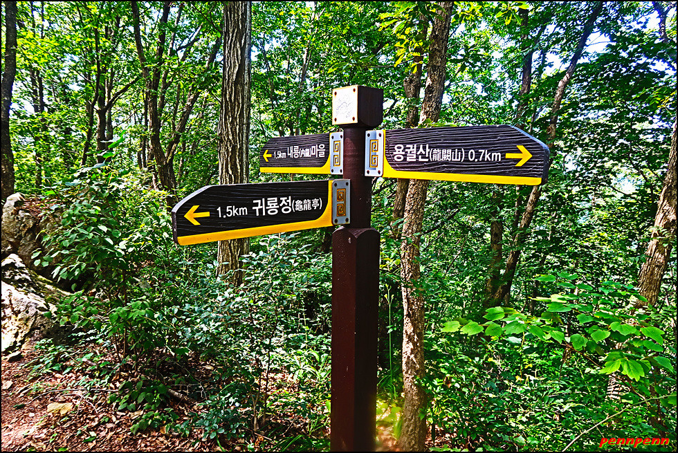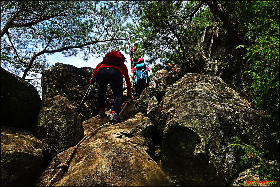 정상에서 내룡고개 방면으로 하산합니다. 능선 끝에 서니 내려 가야할 능선이 매우 편안해 보이지만 실제로는 상당히 가파릅니다. 바위 벼랑 옆으로 조성된 급경사 계단을 내려섭니다. 계단을 내려와 뒤돌아보니 그 기울기가 매우 아찔할 정도입니다. 한참을 가다가 큰 바위를 좌측으로 우회했는데 현지 안내문은 없지만 이 거대한 바위군이 아마도 삼형제바위인듯 보여집니다. 바위가 워낙 커서 사진을 한꺼번에 담을 수 없음이 아쉽습니다.