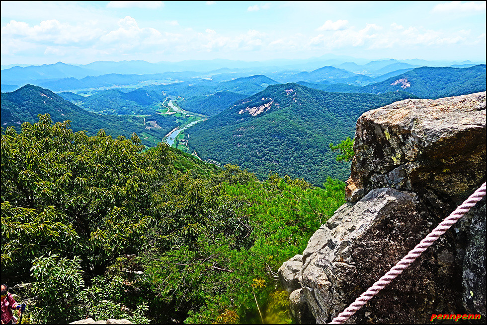 이제부터는 용궐산 정상을 향하여 발걸음을 내딛습니다. 그러나 능선으로 이어진 길은 암릉길이라 상당히 까다로운 등산로이며 또 로프를 잡고 올라야 할 구간도 있습니다. 군데군데 좌측 섬진강 방면으로 멋진 조망이 터지는데 아까 하늘길에서 보았던 동일한 풍경을 더 높은 고도에서 바라본다는 점이 다를 뿐입니다.