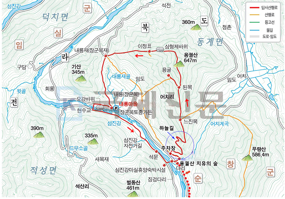 전북 순창군 동계면 소재 용궐산(龍闕山, 647m)은 동쪽을 제외한 삼면이 섬진강으로 에워싸인 산으로, 원래는 용골산(龍骨山)이었으나 용의 해골이라는 이름이 좋지 않다고 해서 2009년 용궐산으로 개명했습니다. 보통 산꾼들은 용궐산의 남남동쪽에 자리 잡은 무량산(587m)과 연계해 산행을 하게 되는데 필자도 이미 6년 전 용궐산-무량산을 이어 답사했지만 이번에는 용궐산에 새로운 하늘길이 생겼다고 하여 찾아 나섰습니다.